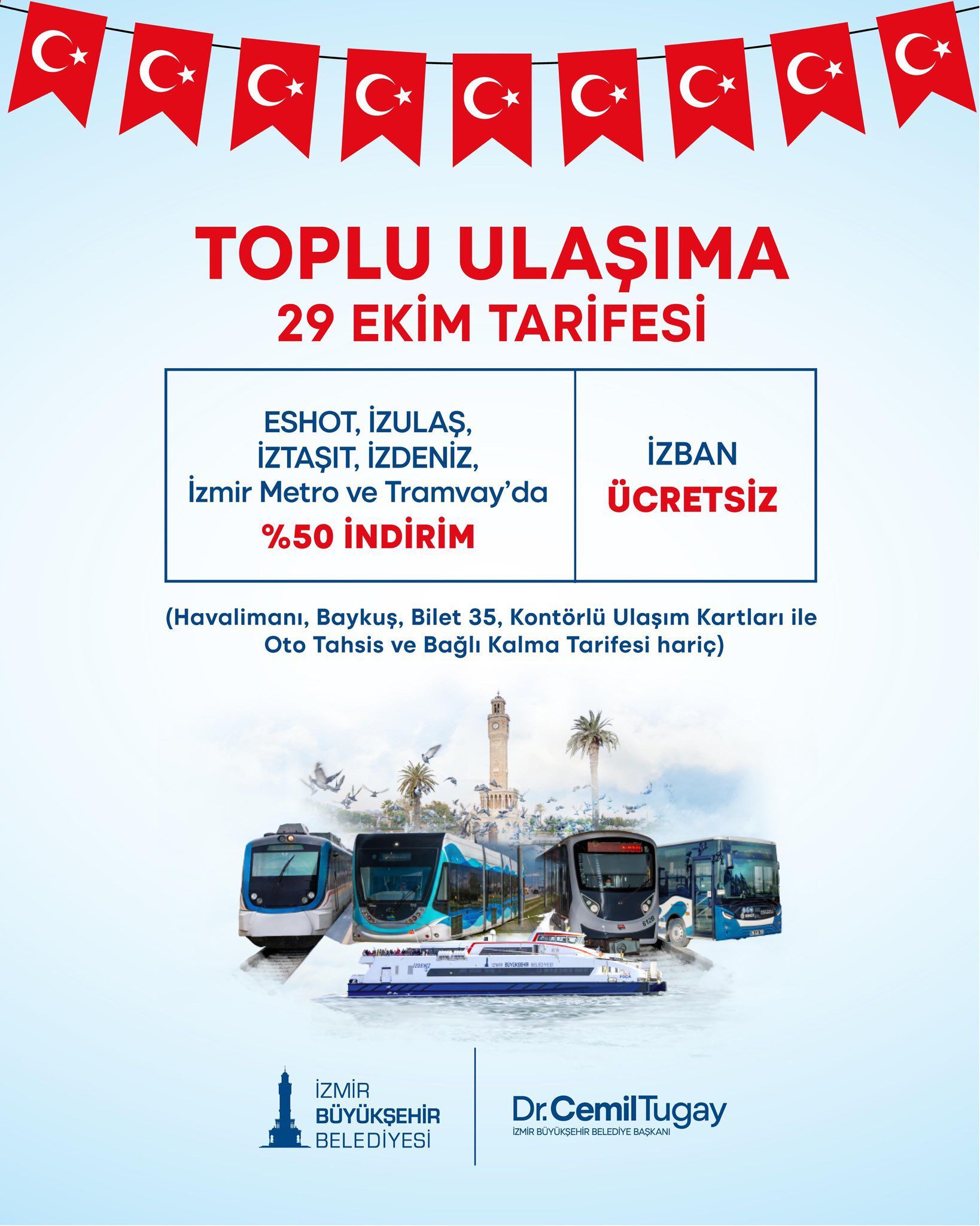 Yapılan açıklamada, indirim ve ücretsiz ulaşımın 29 Ekim Cumhuriyet Bayramı günü geçerli olacağı, uygulamanın Havalimanı, Baykuş, Bilet 35, Kontörlü Ulaşım Kartları, Oto Tahsis ve Bağlı Kalma tarifelerini kapsamadığı belirtildi.