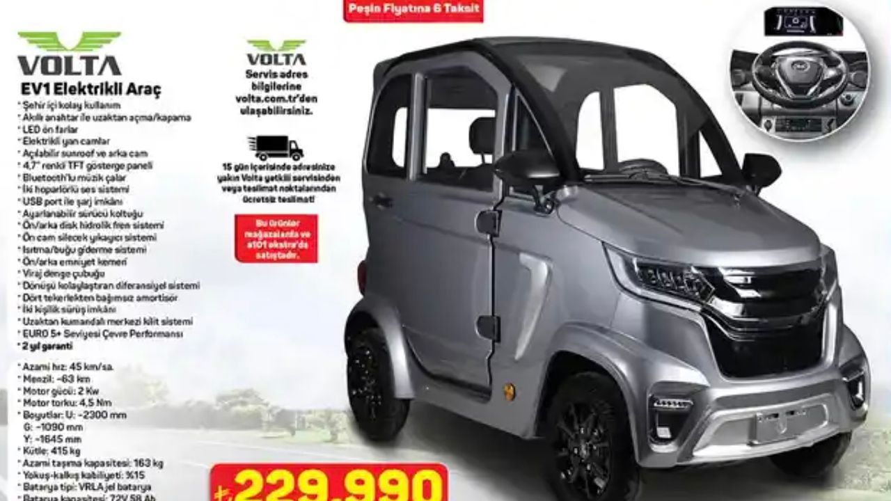 22 Mayıs Perşembe günü başlayan kampanyada Volta EV1’in etiketi 229 .990 TL. A101, kredi kartına altı taksite kadar ödeme imkânı da tanıyor. Bu segmentte benzer mikro otomobillerin 300 bin TL bandını zorladığı düşünülürse, fiyat avantajı belirgin görünüyor.