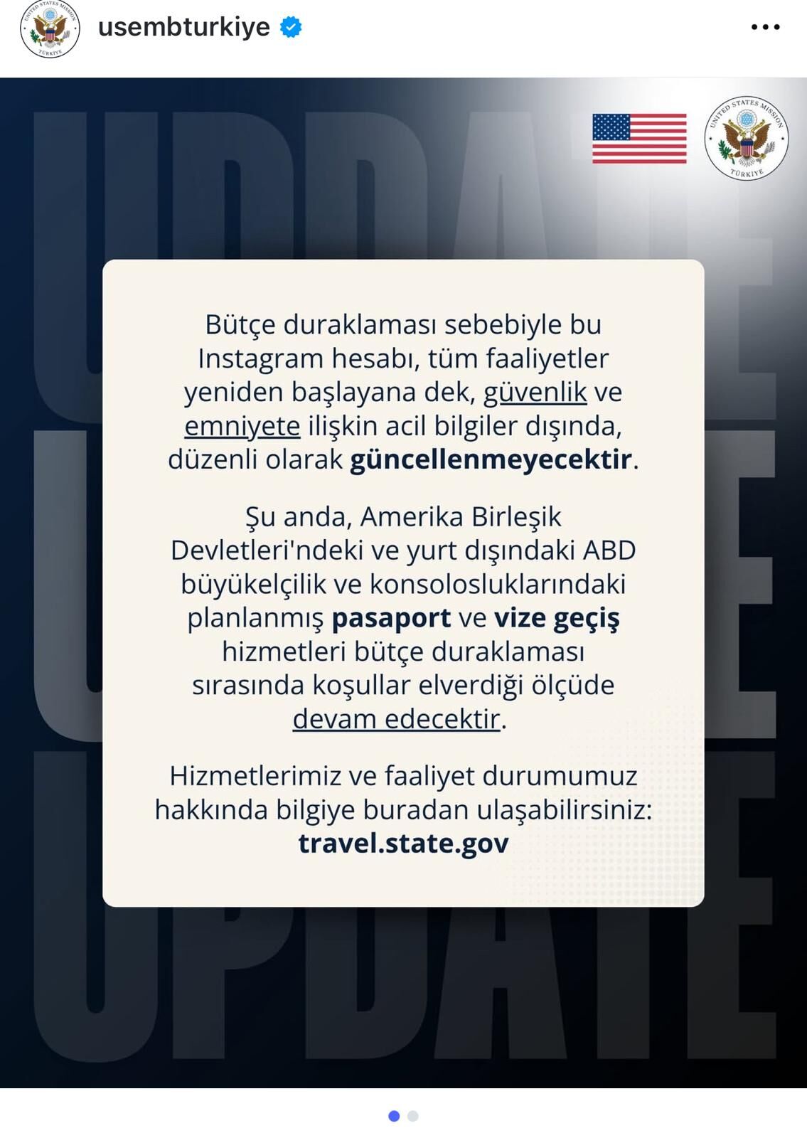 ABD’nin Ankara Büyükelçiliği, bütçe duraklaması nedeniyle resmi X ve Instagram hesaplarının yalnızca acil güvenlik duyuruları için güncelleneceğini açıkladı. Büyükelçilikten yapılan paylaşımda, “Tüm faaliyetler yeniden başlamadan önce bu hesaplar, yalnızca güvenlik ve emniyete ilişkin acil bilgileri paylaşacaktır” ifadesine yer verildi. Bu paylaşımın ardından 2 gündür hesaplarda herhangi bir güncelleme yapılmadığı kaydedildi.