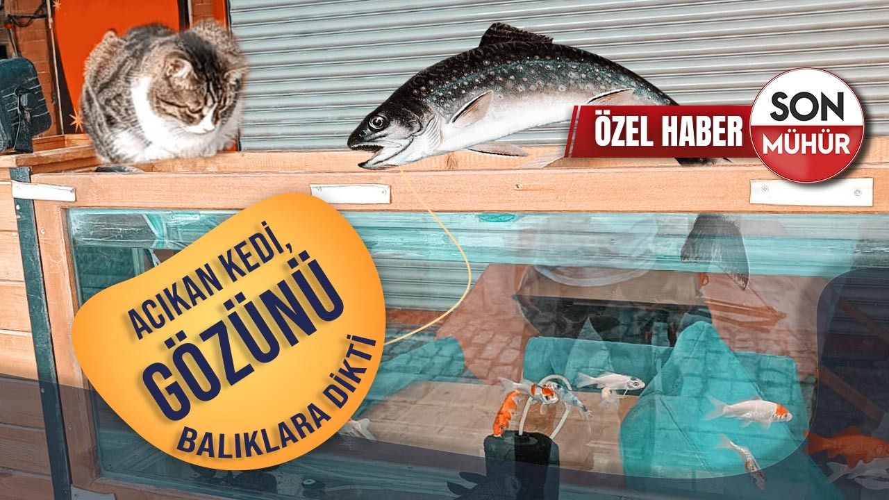 ÇAĞLAR DURSUN / SON MÜHÜR - İzmir'in Konak ilçesinde bulunan bir kafenin bahçe duvarlarında yer alan akvaryum içerisinde yüzen süs balıklarına acıkan sokak kedisi gözlerini dikti. Saatlerce akvaryum içindeki süs balıklarına melül melül bakan kedi, çevreden geçenlere poz vermeyi de ihmal etmedi. Kedinin balıklara gözlerini dikmesi vatandaşlar tarafından ilgiyle ve hoş bir tebessümle izlendi.