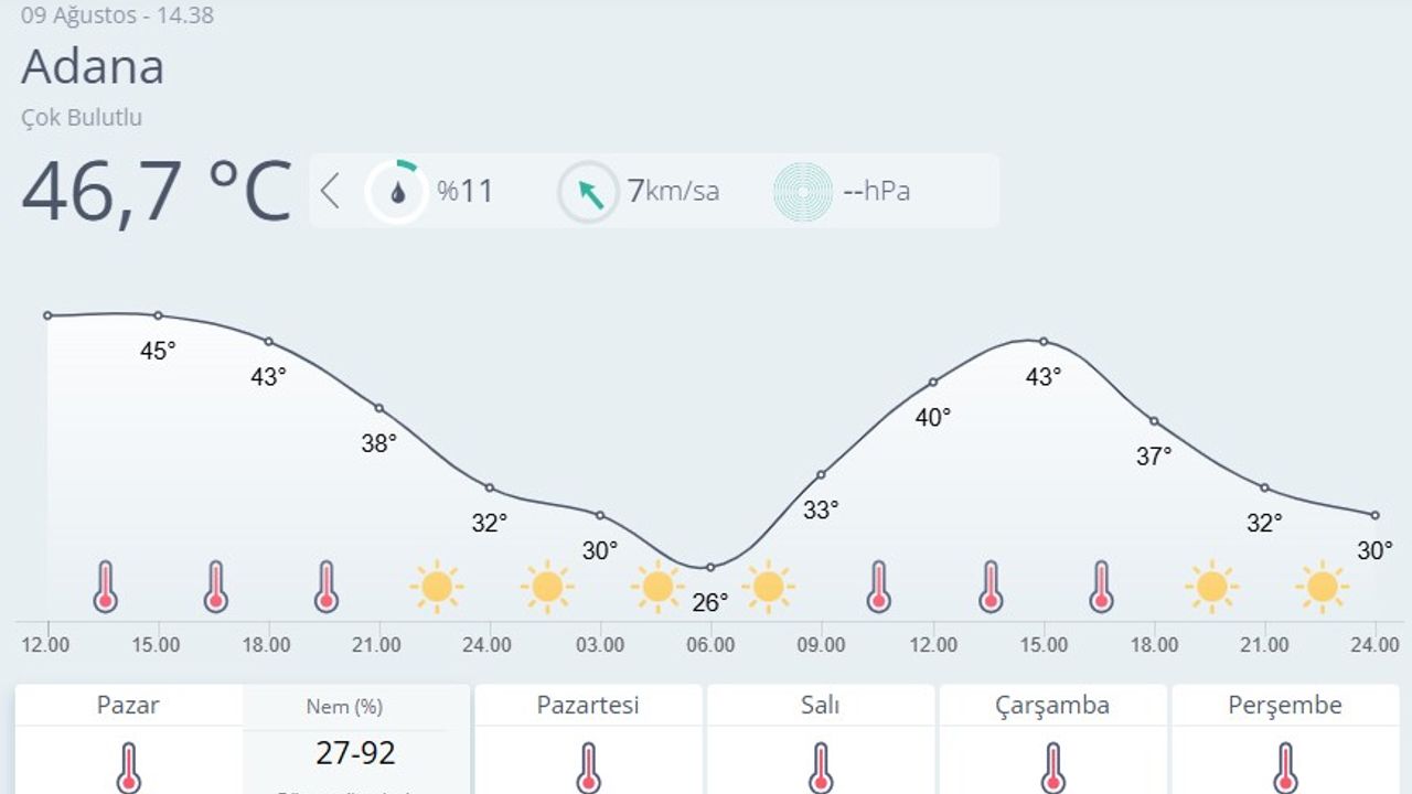Adana’da etkili olan sıcak hava dalgası, şehirde tarihî bir rekorun kırılmasına neden oldu. Meteoroloji Genel Müdürlüğü'nün verilerine göre, 9 Ağustos 2025 tarihinde termometreler 46,7 dereceyi gösterdi. Bu ölçümle birlikte Adana, Ağustos ayında son 95 yılın en sıcak gününü yaşadı.