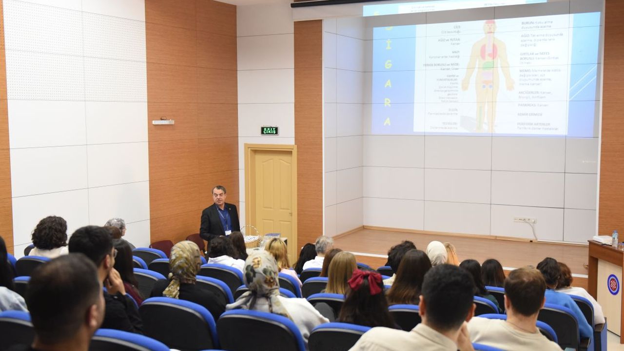 Diş Hekimliği Fakültesi Ağız, Diş ve Çene Cerrahisi Anabilim Dalı Başkanı Prof. Dr. Cemal Akay, “kötü alışkanlıkların bedeli: ağız kanserleri ile yüzleşme” başlıklı sunumunda sigara, alkol ve zararlı maddelerin ağız ve genel sağlık üzerindeki etkilerini anlattı.