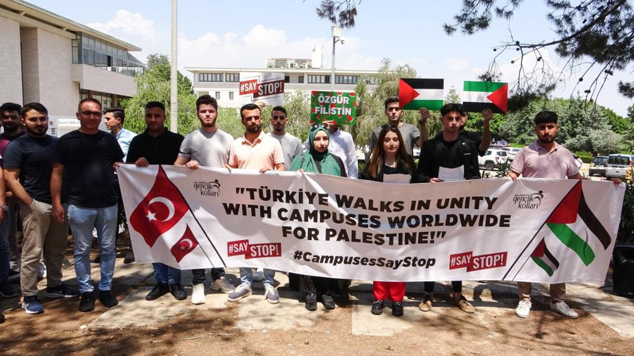 MEÜ'de doktora öğrencisi Gizem Akgün, grup adına yaptığı açıklamada, 1948'den bu yana milyonlarca Filistinliyi göç, kıtlık ve ölümle sınayan İsrail yayılmacılığının, 7 Ekim 2023'ten beri soykırım halini aldığını söyledi.