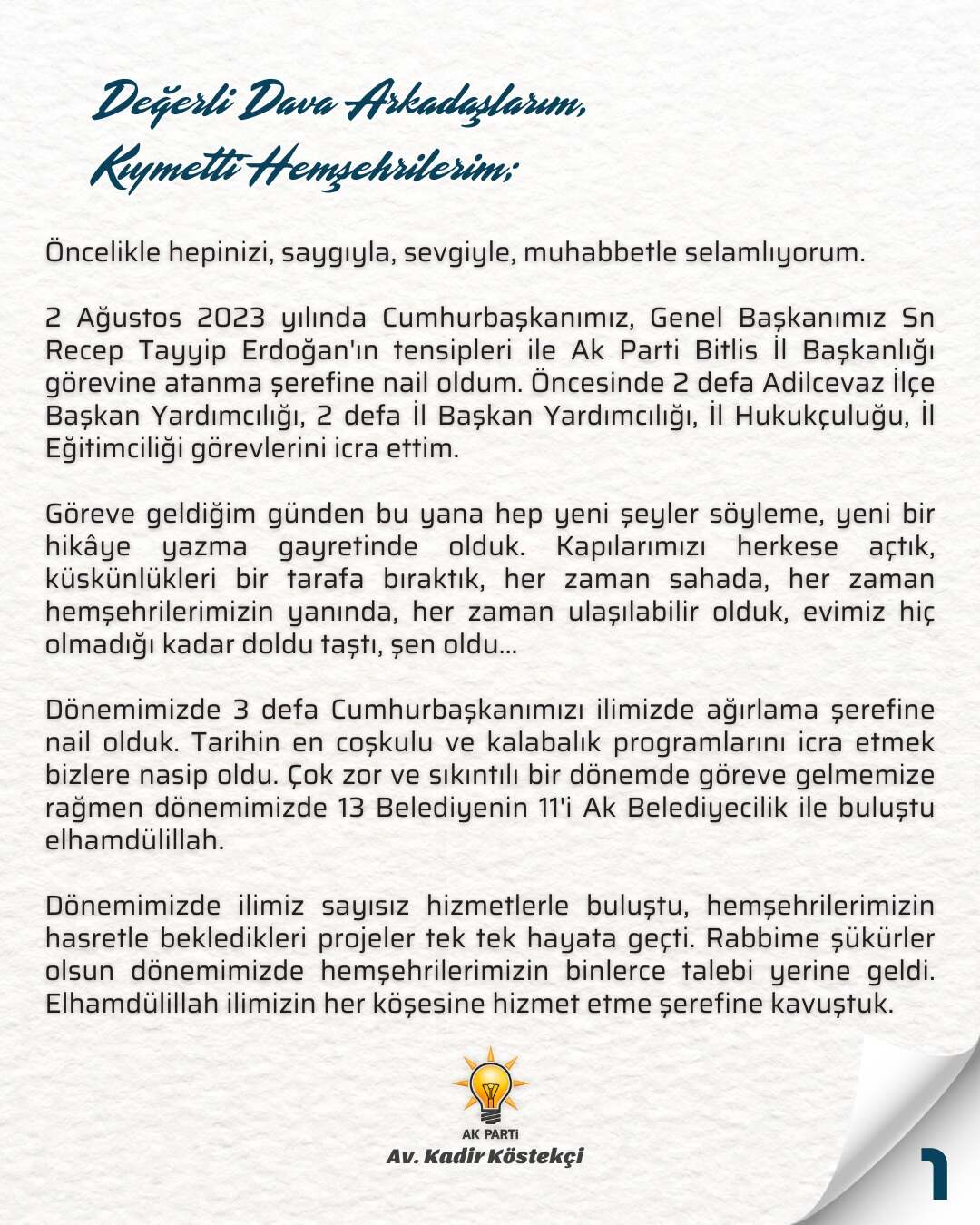 Köstekçi açıklamasında, 2 Ağustos 2023 tarihinde Cumhurbaşkanı ve AK Parti Genel Başkanı Recep Tayyip Erdoğan’ın tensipleriyle Bitlis İl Başkanlığı görevine atandığını hatırlattı. Öncesinde Adilcevaz İlçe Başkan Yardımcılığı, İl Başkan Yardımcılığı, İl Hukukçuluğu ve İl Eğitimciliği görevlerinde bulunduğunu belirtti.