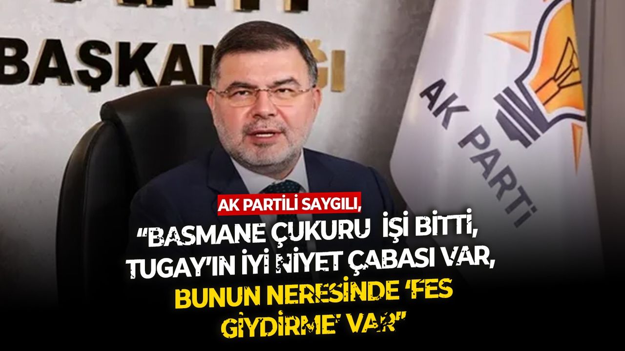 İzmir Büyükşehir Belediyesi eski Başkanı Burhan Özfatura zamanında Basmane Çukuru ile ilgili sürecin başladığını anlatan Saygılı, “Burhan Özfatura ağabeyimizin zamanında bir anlaşma sağlandı. Daha sonra CHP belediyeciliği süreci başladı. Bir türlü konu çözülmedi. Her başkan çözeceğim dedi çözmedi. Allah rahmet eylesin Ahmet Piriştina, Çakmur, Kocaoğlu, Kocaoğlu bu konuyu karşılıklı görüşmelerle 11 hisseyi ’den yüzde 30’a getirdi. TMSF ile. Burada TMSF ile yüzde 30, 70 hissesi oranında yapılan çalışmayı kalkıpta bu işin çözülmesi için uğraşan mevcut İzmir Büyükşehir Belediyesi Başkanı Tugay’a fes giydirme, şalvar giydirme bunlar siyaset dilinde olmayacak şeyler. Siz aynı partinin mensuplarısınız. Üslubunuzun çok nitelikli olması lazım. Biz AK Parti olarak biz bunlara alışık değiliz Biz AK Parti olarak birbirinizin hak ve hukukunu koruyan insanlarız. Biz kardeşlik topluluğuyuz” diye konuştu.