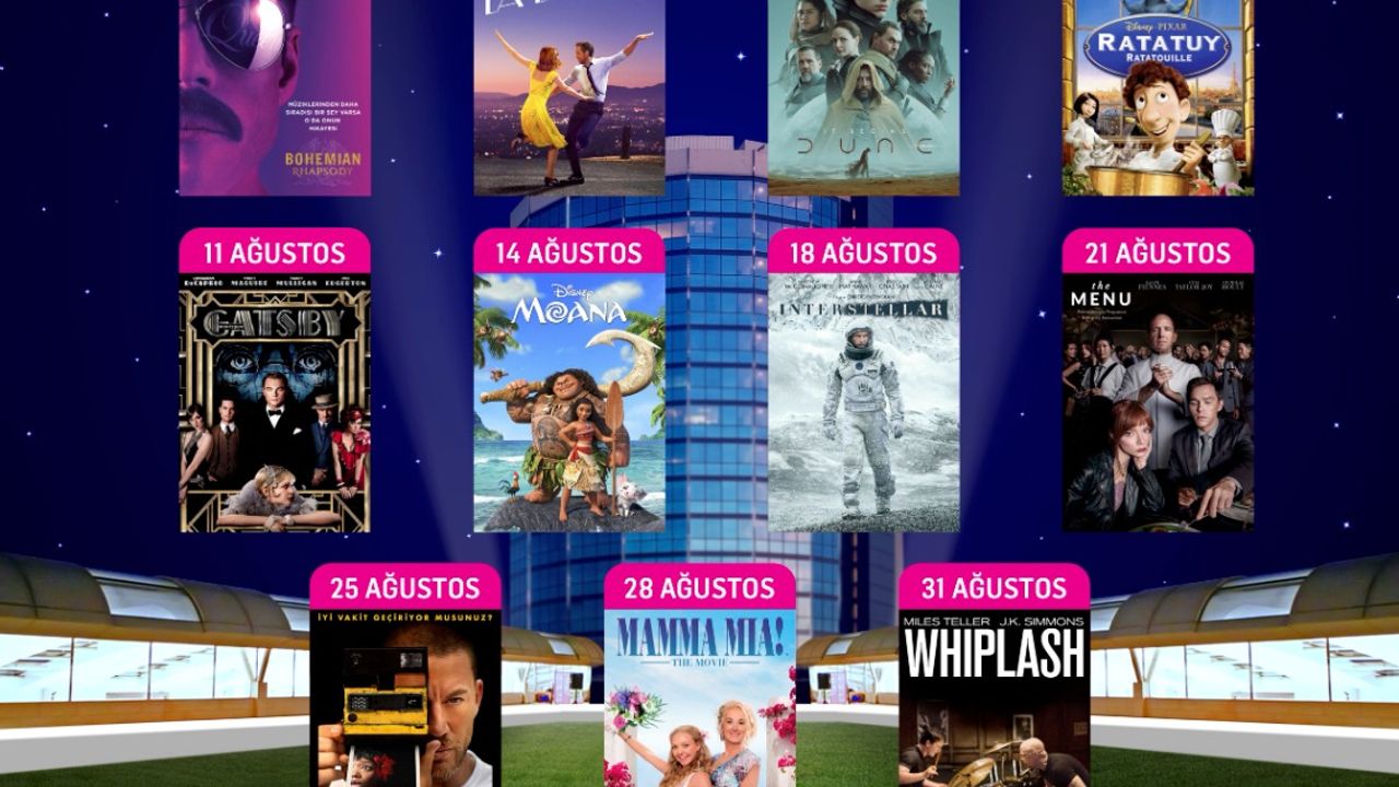 Açılış filmi olan 'Bohemian Rhapsody', ünlü rock grubu Queen'in ve efsanevi solisti Freddie Mercury'nin hayatını anlatan, müzikseverleri büyüleyecek bir yapım. 4 Ağustos'ta, Frank Herbert'in ünlü bilim kurgu romanından uyarlanan 'Dune' filmi gösterilecek. Bu epik yapım, devasa çöl gezegeninde geçen büyüleyici bir hikaye sunuyor. 14 Ağustos'ta ise Disney'in sevilen animasyon filmi 'Moana', Pasifik Okyanusu'ndaki macera dolu yolculuğu ile çocukları ve aileleri büyüleyecek. 28 Ağustos'ta ise müzikal bir şölen sunan Mamma Mia, ABBA'nın en sevilen şarkıları eşliğinde sizlere neşeli ve renkli anlar yaşatacak.
