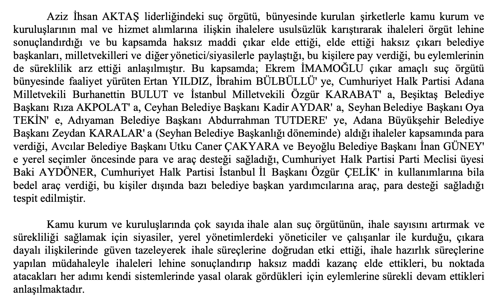 Son Mühür / Yiğit Uzun - İstanbul Cumhuriyet Başsavcılığı'nın yürüttüğü ve belediye ihalelerinde yolsuzluk yapıldığı iddialarını içeren soruşturma kapsamında hazırlanan iddianame, Cumhuriyet Halk Partisi (CHP) mensubu bazı milletvekillerine yönelik ciddi suçlamalarla gündemdeki yerini koruyor. Çıkar amaçlı suç örgütü kurma, ihaleye fesat karıştırma ve rüşvet gibi suçlamaların odağındaki iddianamede, örgüt lideri olduğu iddia edilen Aziz İhsan AKTAŞ'ın, kamu ihalelerini kazanmak için siyasi bağlantılarını kullandığı ve bu çerçevede CHP'li vekillere maddi menfaat sağladığı öne sürülüyor.