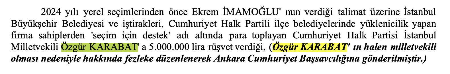 İddianamenin en dikkat çekici bölümlerinden biri, CHP İstanbul Milletvekili Özgür KARABAT'a yönelik rüşvet suçlaması. İddianamede yer alan iddialara göre, 2024 yılı yerel seçimleri öncesinde, dönemin İstanbul Büyükşehir Belediye Başkanı Ekrem İMAMOĞLU'nun talimatıyla hareket ettiği öne sürülen KARABAT, İBB, bağlı kuruluşları ve CHP'li ilçe belediyelerinden iş alan yüklenici firmalardan 'seçim için destek' adı altında para toplama görevini üstlenmiş. Bu süreçte, soruşturmanın kilit ismi ve örgüt lideri olduğu iddia edilen Aziz İhsan AKTAŞ'ın, Özgür KARABAT'a tam 5.000.000 TL rüşvet verdiği iddia ediliyor. Paranın teslimat süreci de iddianamede detaylandırılıyor; örgüt üyesi olmakla suçlanan Ümit GÖZÜTOK ve Ömer GÜNGÖR'ün, bu meblağı Sırrı KÜÇÜK isimli aracı bir şahsa teslim ettiği ve paranın bu şekilde milletvekiline ulaştırıldığı öne sürülüyor. Özgür KARABAT'ın halen milletvekili olması ve yasama dokunulmazlığı bulunması sebebiyle, hakkında T.B.M.M.'ye gönderilmek üzere bir fezleke hazırlandığı ve Ankara Cumhuriyet Başsavcılığı'na iletildiği bilgisi de iddianamede yer alıyor.
