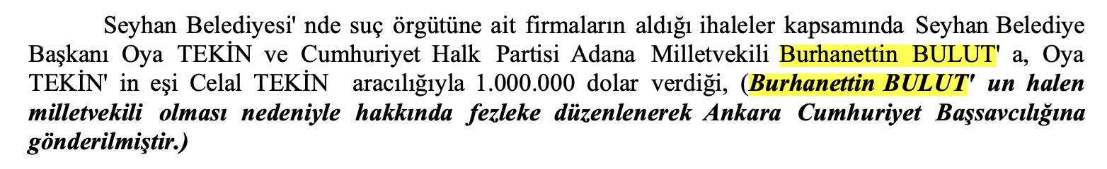 Adana siyasetinin önemli isimlerinden CHP Adana Milletvekili Burhanettin BULUT da rüşvet almakla suçlanan bir diğer isim. İddianamede, Aziz İhsan AKTAŞ liderliğindeki suç örgütünün Adana Seyhan Belediyesi'nden aldığı ihalelerle bağlantılı bir rüşvet mekanizması kurulduğu iddia ediliyor. Bu çerçevede, dönemin Seyhan Belediye Başkanı Oya TEKİN ile birlikte Milletvekili Burhanettin BULUT'un da, örgütün kazandığı ihaleler karşılığında rüşvet aldığı öne sürülüyor. İddiaya göre, toplam 1.000.000 Dolar tutarındaki rüşvet, Oya TEKİN'in eşi olan Celal TEKİN aracılığıyla hem belediye başkanına hem de milletvekiline paylaştırıldı. Burhanettin BULUT'un da yasama dokunulmazlığı nedeniyle hakkında fezleke düzenlenerek Ankara Cumhuriyet Başsavcılığı'na gönderildiği belirtiliyor.