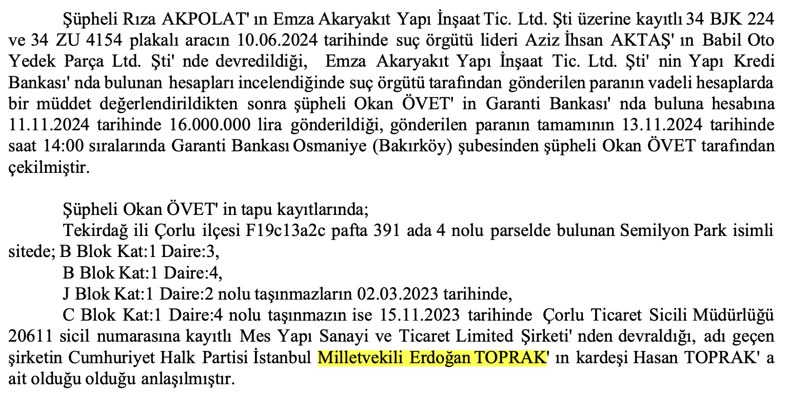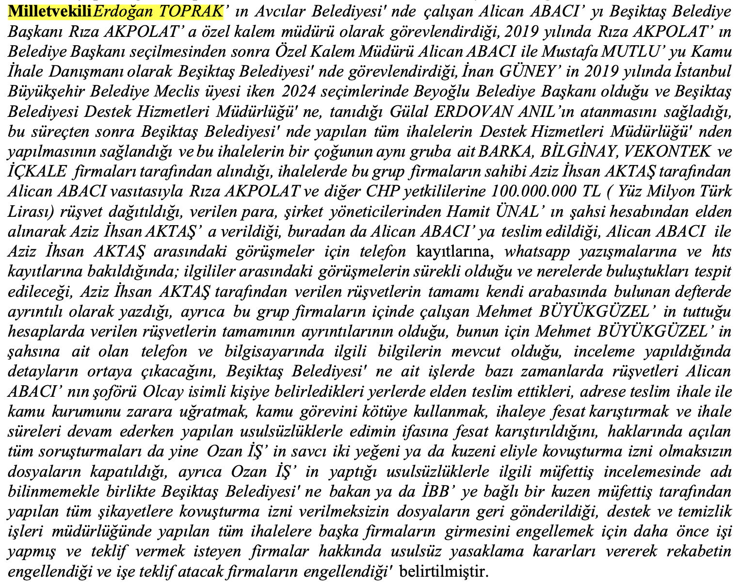 CHP'nin deneyimli siyasetçilerinden Erdoğan TOPRAK'ın adı ise iddianamede doğrudan bir suç isnadıyla yer almıyor; ancak ismi, soruşturmanın seyrini etkileyen kritik bir atama iddiasıyla anılıyor. Başsavcılığa ulaştığı belirtilen bir e-posta ihbarına dayandırılan iddiaya göre TOPRAK, daha önce Avcılar Belediyesi'nde görev yapan Alican ABACI'nın, 2019'da Beşiktaş Belediye Başkanı seçilen Rıza AKPOLAT'a özel kalem müdürü olarak atanmasında rol oynamış. İddianamenin ilerleyen kısımlarında Alican ABACI, Beşiktaş Belediyesi'ndeki ihalelerde usulsüzlük yapmak, rüşvet çarkının merkezinde yer almak ve örgütle işbirliği içinde olmakla suçlanan kilit şüphelilerden biri olarak öne çıkıyor. Her ne kadar Erdoğan TOPRAK'a yönelik doğrudan bir suçlama veya menfaat temini iddiası bulunmasa da, ihbarda yer alan bu atama iddiası, sonraki süreçte yaşandığı öne sürülen usulsüzlüklere zemin hazırlayan bir adım olarak ima ediliyor.