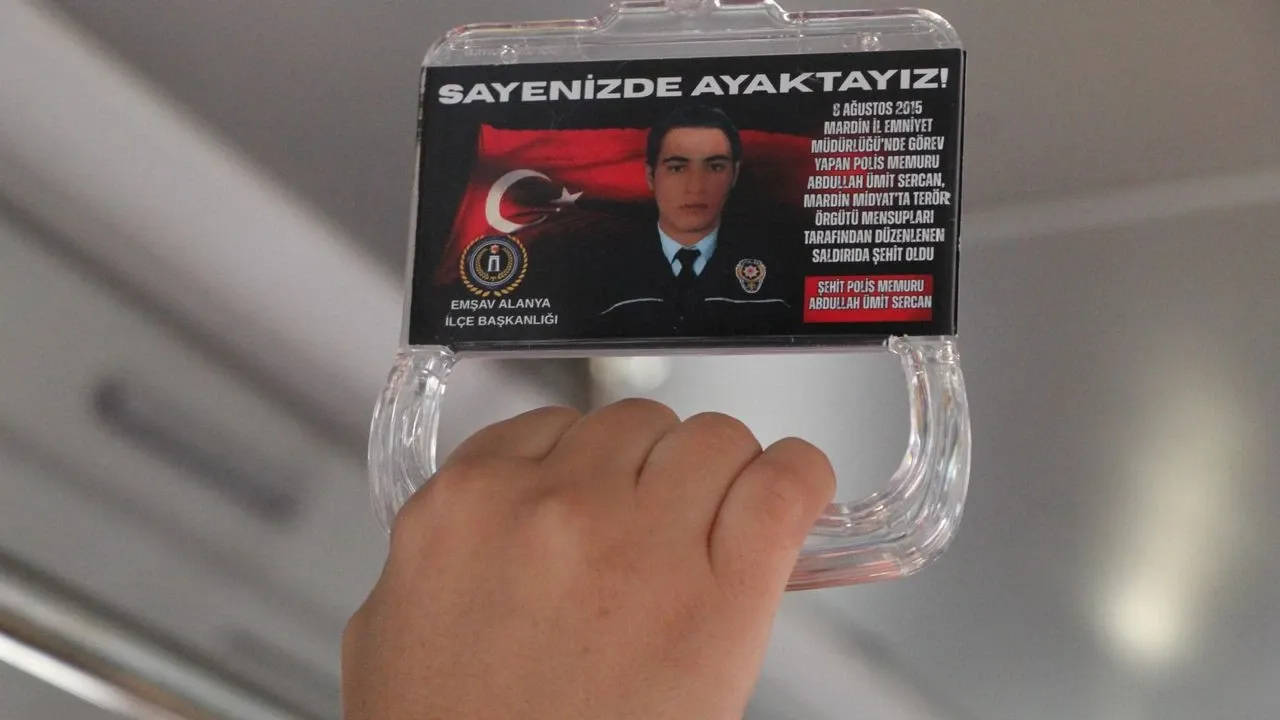 Alanya’da şehitlerin adını yaşatmak amacıyla anlamlı bir proje hayata geçirildi. Emniyet Teşkilatı Vazife Malulü ve Şehit Aileleri Vakfı (EMŞAV) Alanya İlçe Başkanlığı, şehirdeki özel halk otobüslerine şehit asker ve polislerin fotoğraf ve isimlerinin yer aldığı tutacaklar yerleştirdi. Türk bayrağı ile “Sayenizde ayaktayız” ifadelerinin bulunduğu tutacaklarda, Alanya’da şehit olan 9 güvenlik mensubunun fotoğrafları yer alıyor.