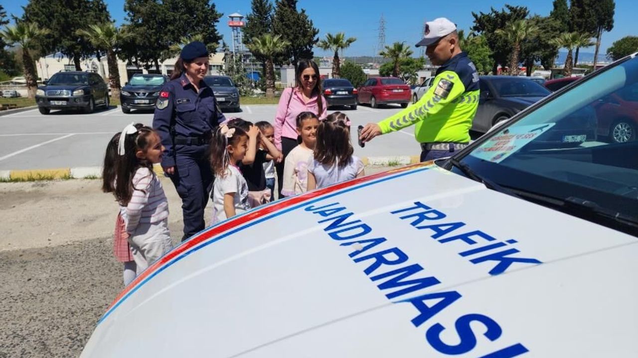 Bahçede duran jandarma araçlarına minik öğrenciler sırayla bindi. Telsizlere göz atıp, sirenlerin nasıl çalıştığını gören minikler heyecanla her şeyi deneyimledi.