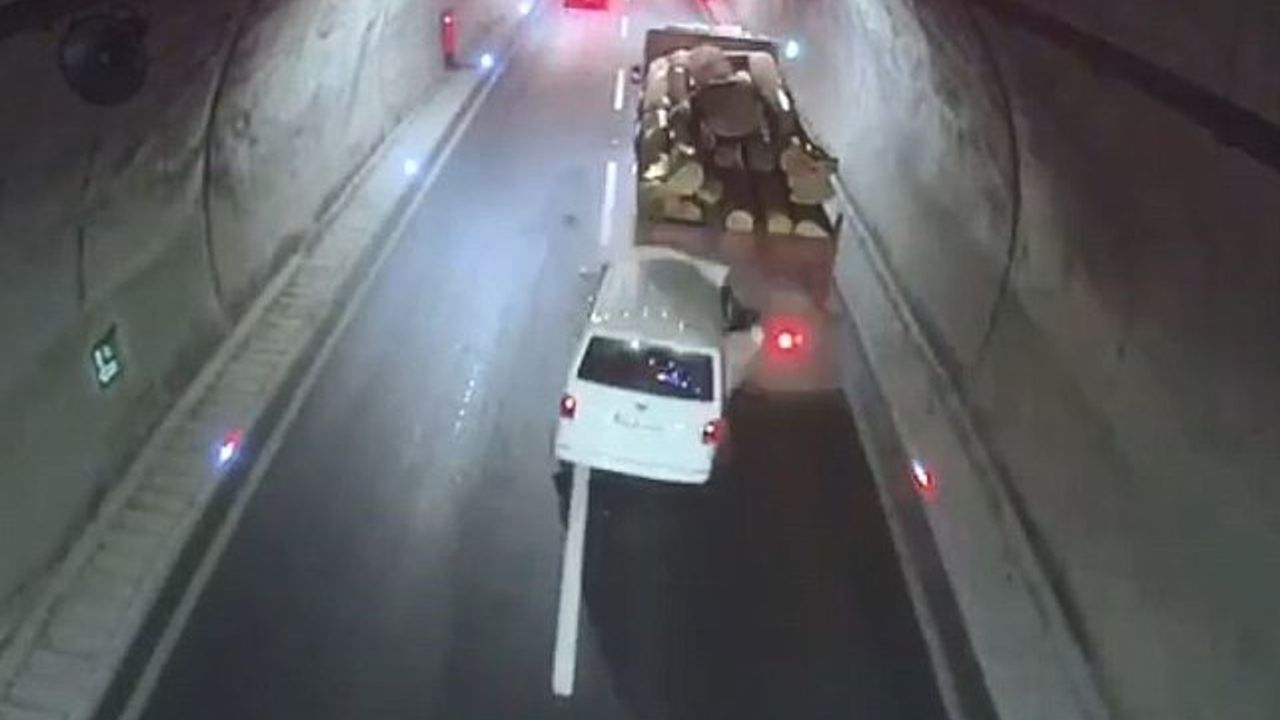 Kaza anına ait görüntüler ortaya çıktı. Görüntülerde sağ şeritten dörtlüleri yakıp ağır ağır ilerleyen kamyona arakadan minibüsün çarptığı görülüyor.