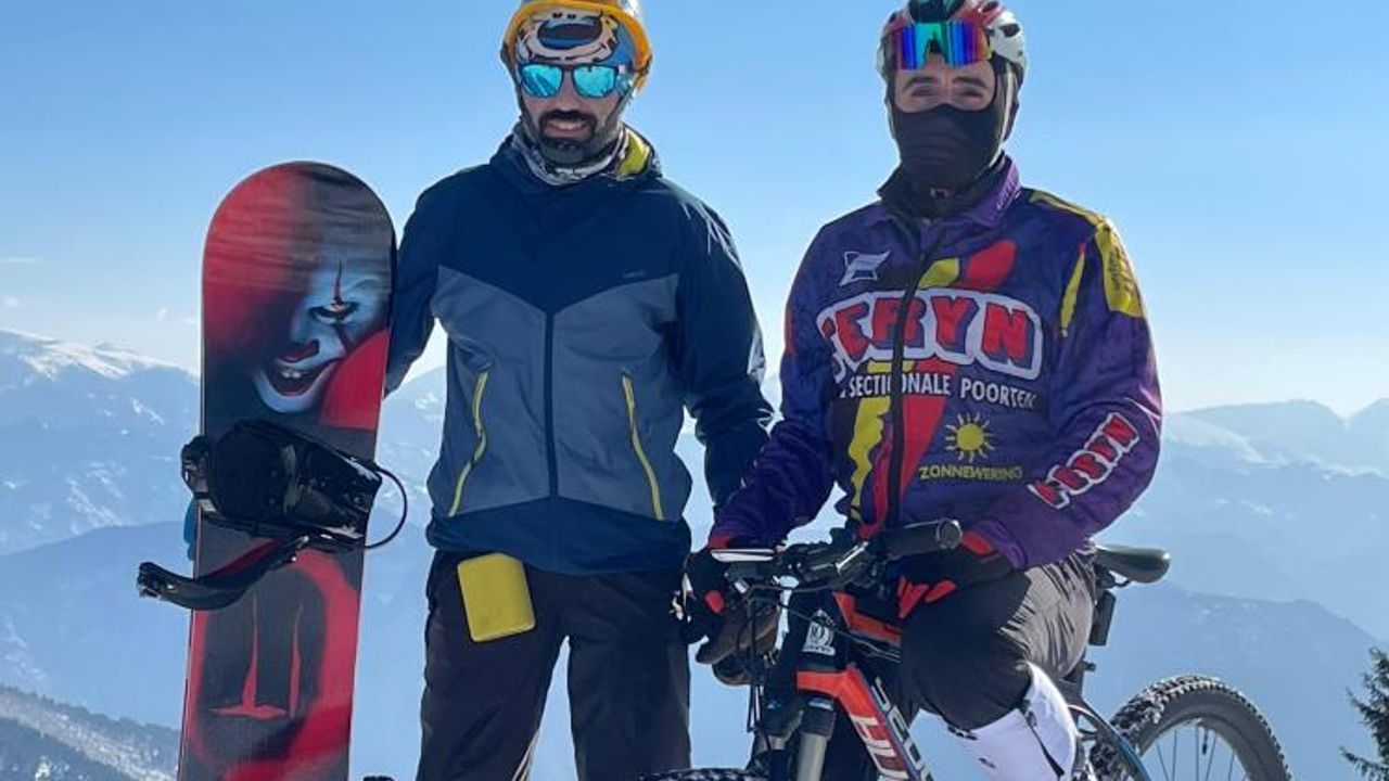 İki sporcu, bin 300 metrelik kayak pistinden bisikletleriyle iniş yaparak adrenalin dolu bir gösteri sundu. Telesiyejle zirveye çıkmak için bisikletlerini kucaklarında taşıyan ikili, karlı ve soğuk zemine aldırış etmeden hızla pedal çevirdi.