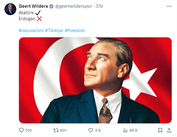Hollandalı ağırı sağcı lider 19 Mayıs Atatürk'ün Anma Gençlik ve Spor Bayramı'nın ilk dakikalarında yine manidar bir paylaşımda bulunarak Atatürk'ün fotoğrafı ve Atatürk'e evet, Erdoğan'a hayır anlamına gelen mesajı paylaştı.