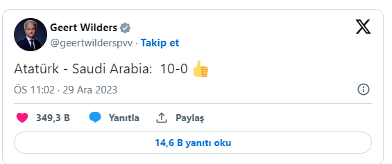 Suudi Arabistan'da yapılacak Süper Kupa maçında karşılaşacak olan Galatasaray ve Fenerbahçe'nin, Atatürk görseli taşıyan tişörtlerin giyilmesine izin verilmemesi üzerine Türkiye'ye dönme kararı almasının ardından Hollanda seçimlerinin galibi Geert Wilders de bir paylaşımda bulunmuş ve Wilders, "Atatürk - Saudi Arabia: 10-0" ifadesini paylaşmıştı.