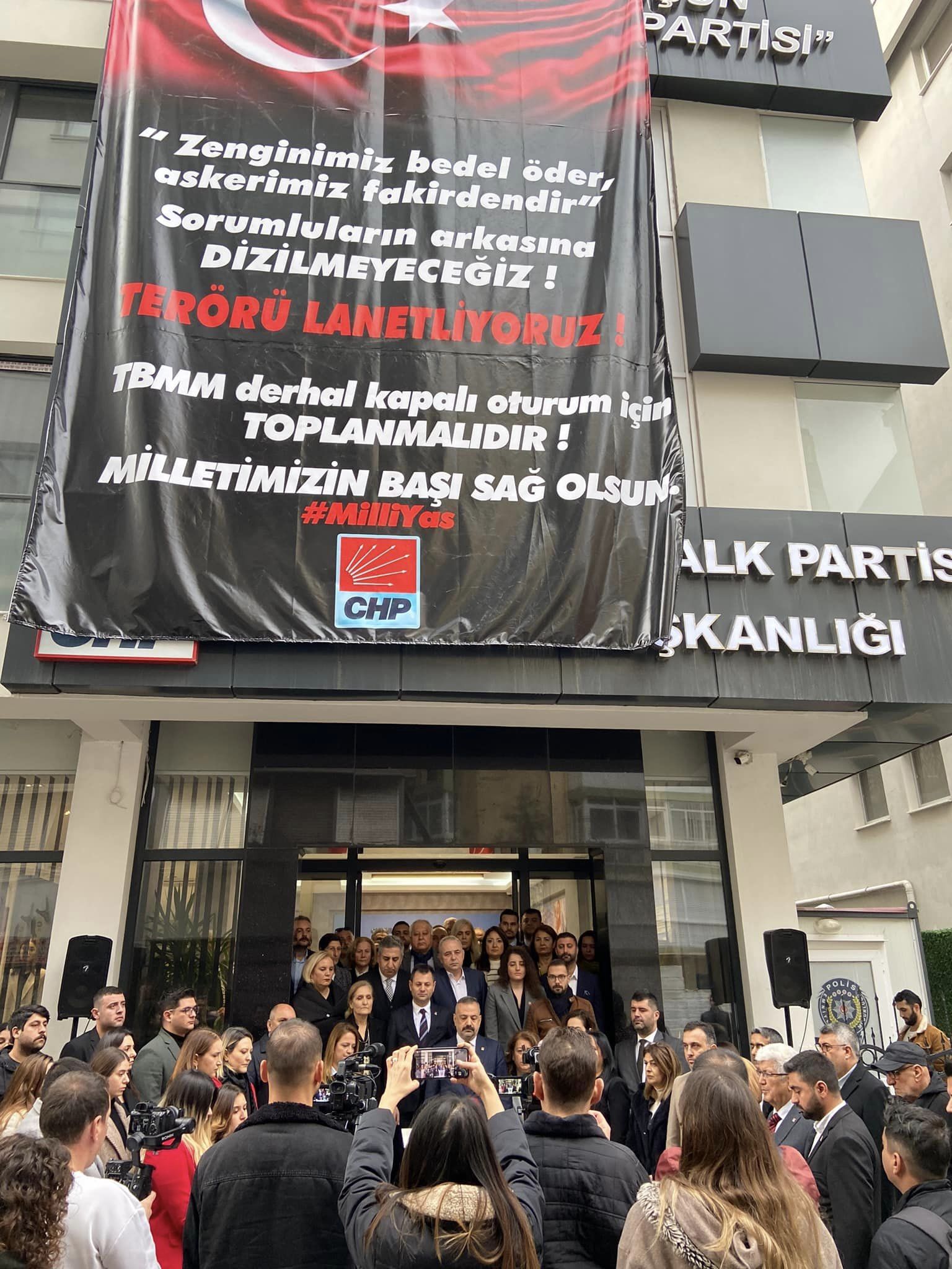 CHP İzmir İl Başkanı Şenol Aslanoğlu şehitleri tek tek sayarak “22-23 Aralık 2023 gecelerinde arka arkaya gelen kara haberlerle sarsıldık. Pençe Kilit Harekat bölgesinde 12 vatan evladımızı bölücü terör örgütünün hain saldırılarında şehit verdik. Yüreğimiz yandı, bağrımıza taş oturdu. Acımız büyük. Bugün, gencecik vatan evlatlarını toprağa verdiğimiz hain terör saldırılarına, bu insanlık dışı saldırıların yol açtığı onarılmaz acılara artık yeter demek için buradayız. Piyade Teğmen Ramazan Günay, Piyade Uzman Çavuş Mehmet Serinkan, Piyade Uzman Onbaşı İsmail Yazıcı, Piyade Sözleşmeli Er Semih Yılmaz, Piyade Uzman Çavuş Abdulkadir İyem, Piyade Uzman Çavuş Ahmet Arslan, Piyade Sözleşmeli Er Emre Taşkın, Piyade Sözleşmeli Er Yasin Karaca, Piyade Sözleşmeli Er Çağatay Erenoğlu, Piyade Sözleşmeli Er Cebrail Dündar, Piyade Sözleşmeli Er Enis Budak, Piyade Sözleşmeli Er Kemal Aslan… Şehitlerimizin her birinin ayrı bir hikayesi, arkada bıraktıkları aileleri, evlatları, eşleri var. Şehitlerimize bir kez daha Allah’tan rahmet, acılı ailelerine başsağlığı ve sabır, yaralanan askerlerimize şifa diliyoruz. Terörü, bölücü terör örgütü PKK’yı ve insanlık dışı yöntemlerini lanetliyoruz. Sadece kınamıyoruz; lanetliyoruz! Toprağa verdiğimiz kahraman evlatlarımızın, bütün şehitlerimizin aziz hatıralarını sonsuza dek yaşatacağımıza söz veriyoruz. 81 vilayetin hiçbir yerine ateş düşmesin diye; bu sorumluluğumuzu yerine getirmeye, sorulması gereken soruları sormaya sonuna kadar devam edeceğiz. Bizler, terör örgütleriyle müzakere masasına oturanlarla, “Birkaç Mehmet öldü diye Meclis’i mi toplayacağız” diyenlerle, siyasi çıkarları için bölücü terör örgütünün liderinin mektubunu devletin kanalında okutanlarla, Meclis kürsüsünde “Eyalet, özerklik ve federasyon tartışılmalı” diyenleri yerli ve milli ilan edenlerle hizalanmayacağız” dedi.