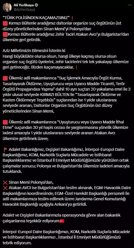 Bakan Yerlikaya, operasyon kapsamında Atakan Avcı’nın Bulgaristan’dan, Sinan Memi’nin ise Polonya’dan yakalanarak Türkiye’ye getirildiğini belirtti.