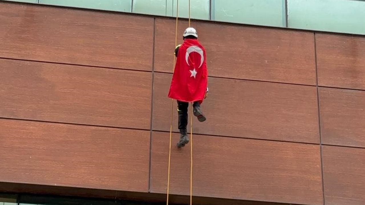 Mardin Nusaybin’de Türk bayrağına yönelik gerçekleştirilen çirkin saldırıya tepkiler çığ gibi büyürken, Aydın’dan unutulmaz bir duruş geldi. Endüstriyel dağcılık uzmanı Barış Özbey, profesyonel ekipmanıyla metrelerce yüksekliğe tırmanarak ay yıldızlı sancağı zirveye taşıdı.