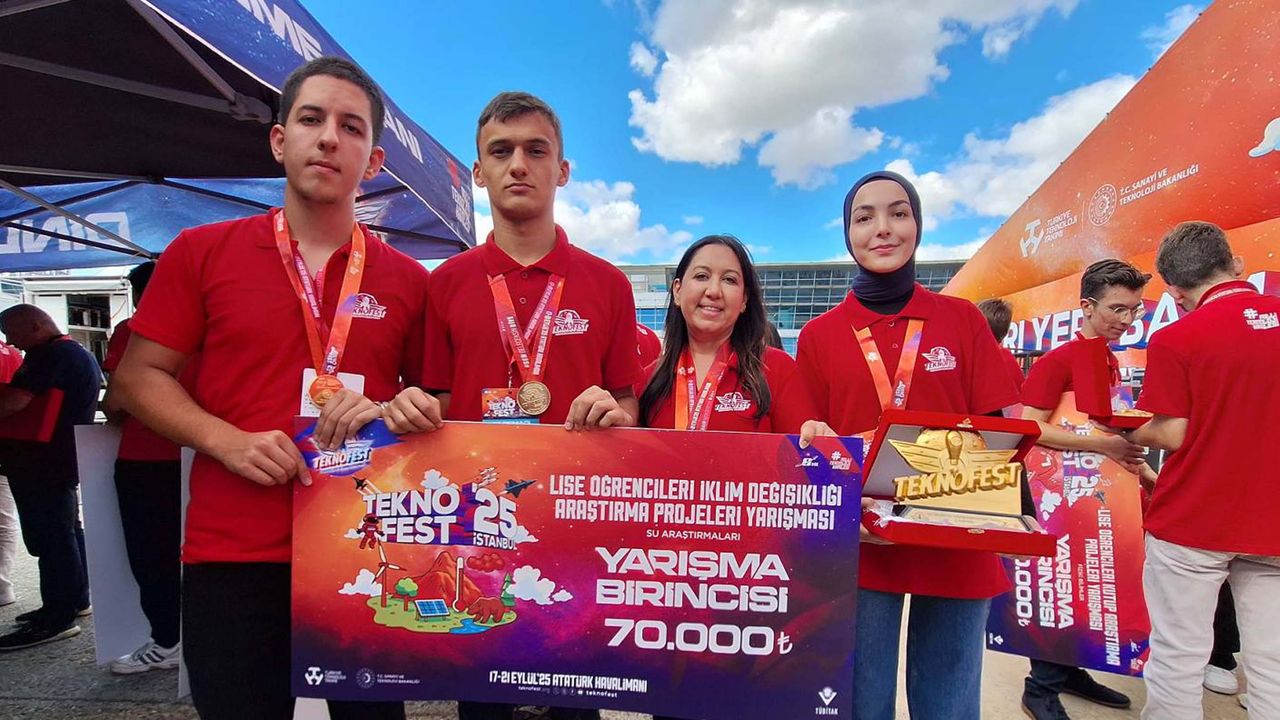 TEKNOFEST 2025’te düzenlenen “Lise Öğrencileri İklim Değişikliği Araştırma Projeleri Yarışması”nda Türkiye birincisi olan Aydın’daki Nazilli Fen Lisesi ALP Takımı, ödülünü Cumhurbaşkanı Recep Tayyip Erdoğan’ın elinden aldı.