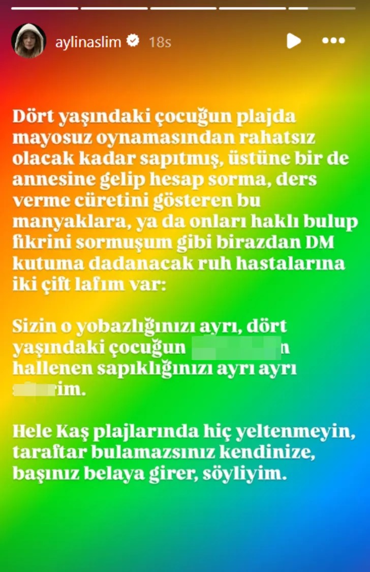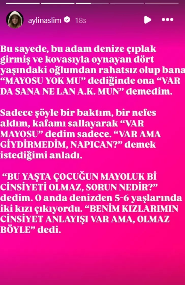 Yaşananların ardından sosyal medya hesabından tepkisini dile getiren aslım, “dört yaşındaki çocuğun plajda mayosuz oynamasından rahatsız olacak kadar sapıtmış insanlara iki çift lafım var” ifadeleriyle sert çıkış yaptı.