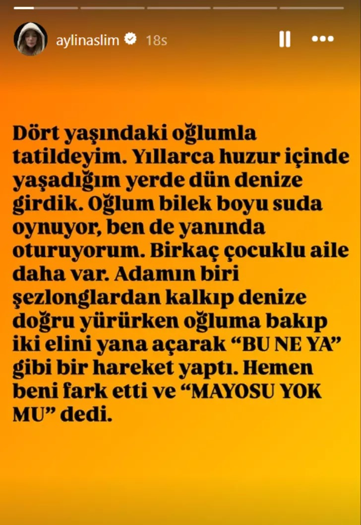 Aslım, sosyal medya hesabından yaptığı paylaşımda, plajda oğlunu bilek hizasında suda oynatırken bir adamın yanlarına gelip rahatsız edici bir şekilde, “mayo yok mu?” diye sorduğunu anlattı.
