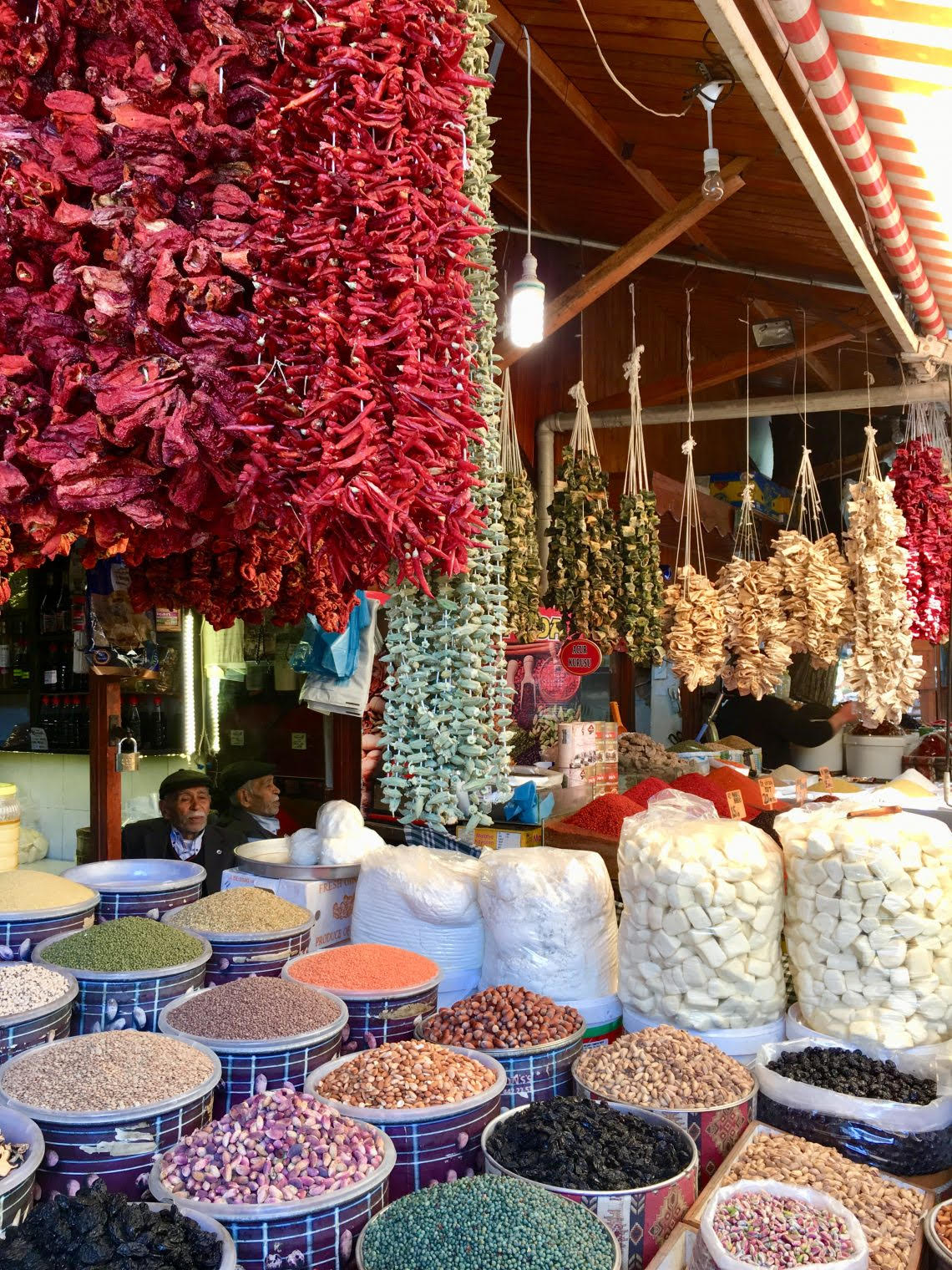 Taş parkeli yolları üzerinde ahşap dükkânlardan oluşan Kürkçü Han ve Bakırcılar Çarşısının hemen karşısında yer alan Almacı (Elmacı) Pazarı ve çevresindeki baharatçı dükkânları, beş duyuya birden hitap eder. Renkler, kokular, dokular, sesler ve tatlar bir ahenk içinde sizi kendine çeker. Aktarların çatılarından sarkan rengârenk dolmalık patlıcan ve biber kuruları hem renkleri hem de çıkardıkları seslerle gezenleri cezbeder. Dertlere deva şifalı otlar, baharatlar, kuruyemişler, cevizli sucuklar ve pestiller, hem kokuları hem tatlarıyla büyüleyici bir farkındalık yaşatır.