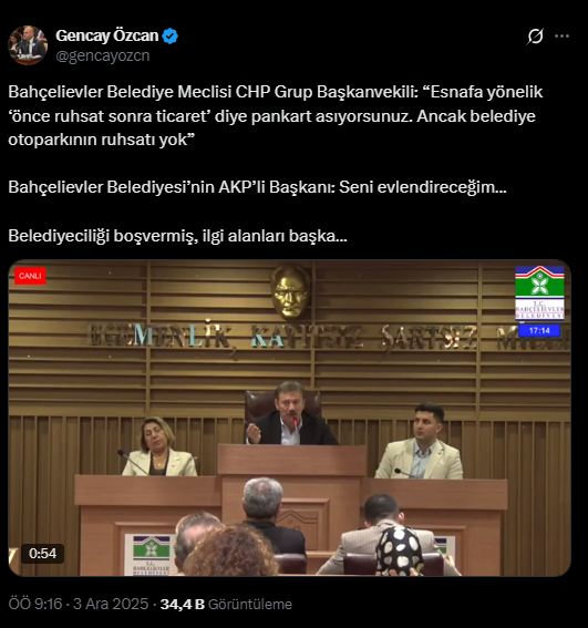 Son Mühür- Bahçelievler Belediyesi’nde, meclis çoğunluğunu Cumhuriyet Halk Partisi’nin (CHP) oluşturduğu ortamda, AK Parti’li Belediye Başkanı Hakan Bahadır’ın sözleri tartışma yarattı. CHP Grup Başkanvekili ve İstanbul Büyükşehir Belediyesi (İBB) Grup Sözcüsü Gencay Özcan’a yönelik ifadeleri, meclis üyeleri ve salondaki vatandaşlar tarafından tepkiyle karşılandı.
