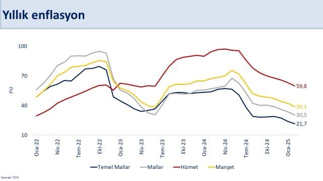 Mehmet Şimşek, yıllık enflasyonun 9 aydır gerilediğini belirtti. Şubat ayında yıllık enflasyonun yüzde 39,1 olarak gerçekleştiğini ifade eden Bakan, şu bilgileri paylaştı: "Temel mallarda yıllık enflasyon geçen yılın aynı ayına göre 32 puan düşüşle yüzde 21,7, hizmet enflasyonu ise 35 puan düşüşle yüzde 59,8 oldu."