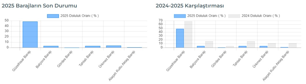 Balçova Barajı’nın doluluk oranı geçen yıl bu dönem yüzde 15,78 seviyesindeyken yüzde 3,15’e; geçen yıl yüzde 10,5 olan Ürkmez Barajı’nın doluluk oranı yüzde 3,35’e, Alaçatı Kutlu Aktaş Barajı’nın doluluk oranı yüzde 10,75’ten yüzde 0,13’e, Güzelhisar Barajı’nın doluluk oranı ise yüzde 67,46’dan yüzde 48,4’e düştü.