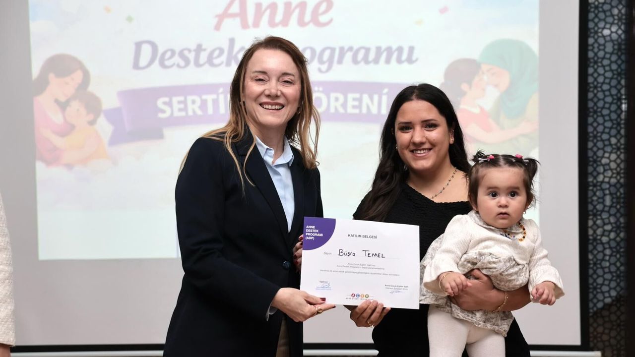 Son Mühür/Merve Turan- İzmir'in Konak ilçesinde belediye ve AÇEV tarafından geçekleştiren Anne Destek Programı'nı bitiren 25 anne sertifikalarını Konak Belediye Başkanı Nilüfer Çınarlı Mutlu'dan aldı. Çocuk sahibi olmak isteyenlerin mutlaka eğitimden geçmesi gerektiğini dile getiren Mutlu bu programın amacının çocuk gelişimi konusundaki bilgi ve becerilerini güçlendirmeyi hedeflediğini söyledi.