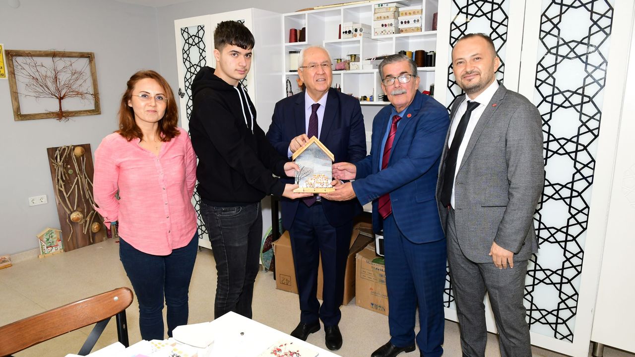 Derslik ve atölyeleri gezen Başkan Selvitopu'na öğrenciler, ahşap ve seramikten el emekleriyle yaptıkları eşyaları armağan ettiler.