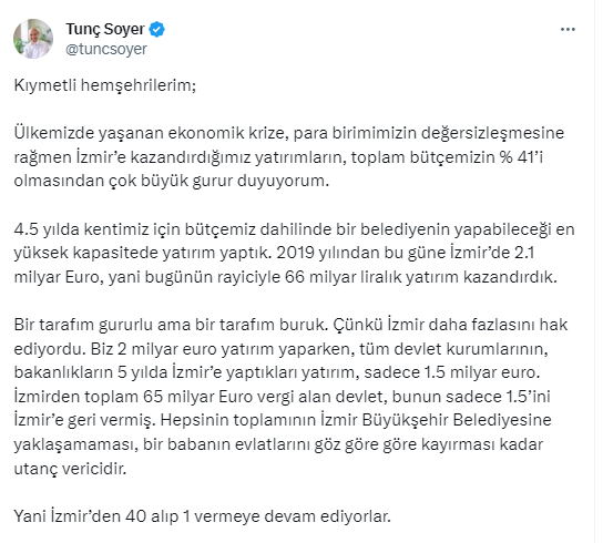 İşte Tunç Soyer'in sosyal medya paylaşımı...