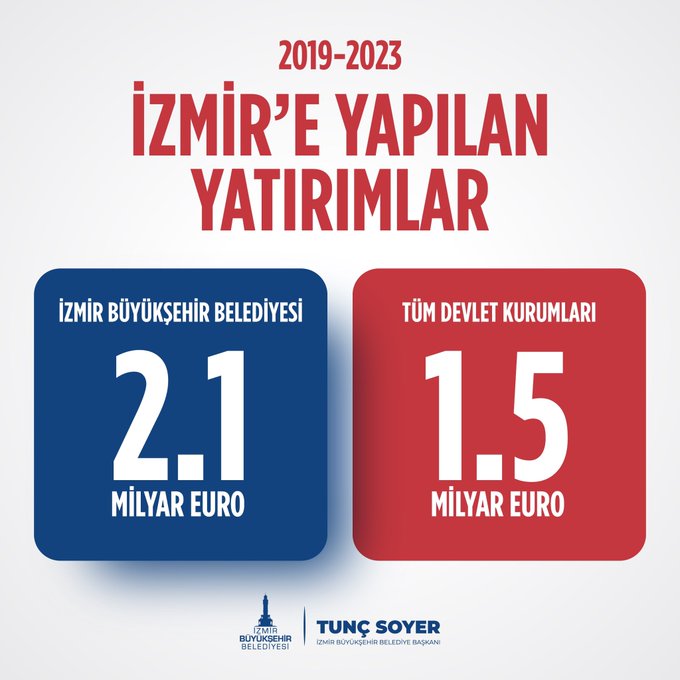 İmir Büyükşehir Belediye Başkanı Tunç Soyer hükümetin son beş yılda İzmir'e yaptığı yatırımın kendi yaptıkları yatırıma göre çok daha az olduğuna dikkat çekerek 'Biz 2 milyar euro yatırım yaparken, tüm devlet kurumlarının, bakanlıkların 5 yılda İzmir’e yaptıkları yatırım, sadece 1.5 milyar euro. İzmirden toplam 65 milyar Euro vergi alan devlet, bunun sadece 1.5’ini İzmir’e geri vermiş. Hepsinin toplamının İzmir Büyükşehir Belediyesine yaklaşamaması, bir babanın evlatlarını göz göre göre kayırması kadar utanç vericidir' hatırlatmasında bulundu.