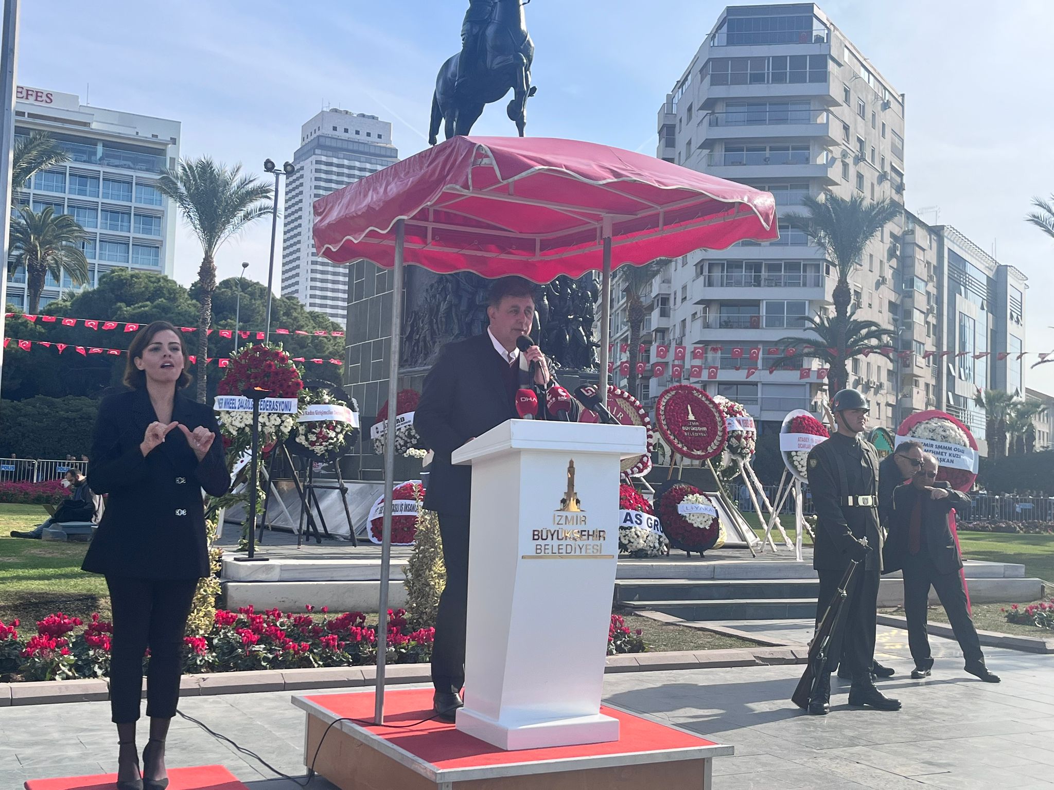 Başkan Tugay, yapmış olduğu konuşmasında, "Ey liderlerinden büyüğü bugün günlerden aynı zamanda ne yazık ki bizim için mahcubiyet bizlere emanet ettiğin Cumhuriyet'i muhasır medeniyetler seviyesine ulaştırmayı başaramadık mahcubuz. Mahcubiyetimiz mecburiyetimizdir. Bu ülkeyi tarif ettiğin seviyeye getirmeye mecburuz. Ey şehrimize güzel İzmir diyen en kıymetli hem şehrimiz, senin güzel İzmir dediğin bu aziz şehrin fikri hür vicdani hür temiz kalpli insanların belediye başkanı olarak sorumluluğunun farkındayım" dedi.