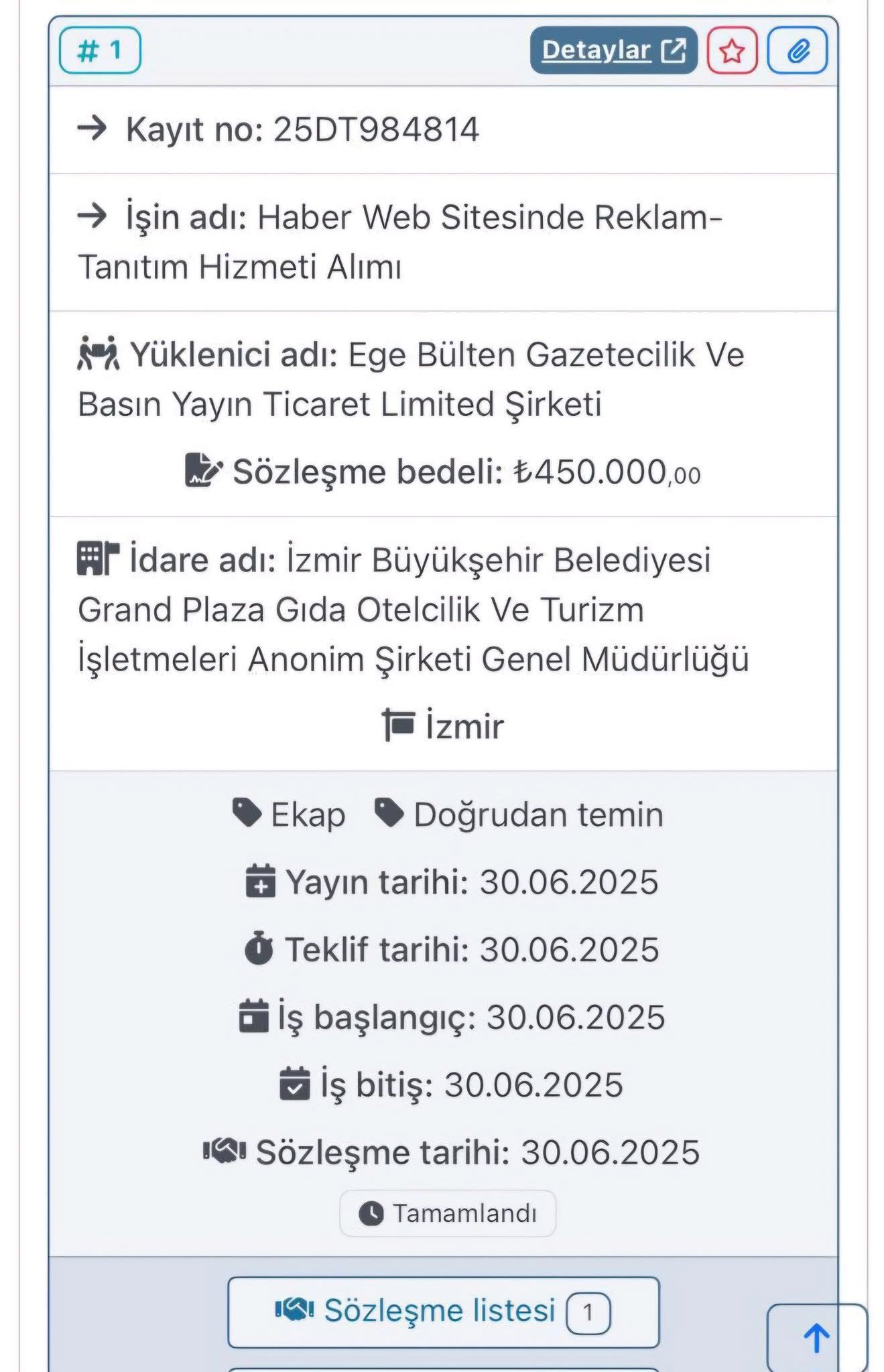 30 Haziran 2025 tarihinde ise bu kez belediyenin kafeteryalarını işleten Grand Plaza A.Ş EKAP’ta ‘Web sitesinde reklam tanıtım hizmet alımı’ doğrudan temin yöntemiyle ihale etti. Aynı gün teklifleri toplayan ve sözleşme yapan Grand Plaza, reklamı da yayınlattı. 450 bin liralık bu işi de ne tesadüf ki Ege Bülten Gazetecilik ve Basın Yayın Ticeret Limited Şirketi aldı.