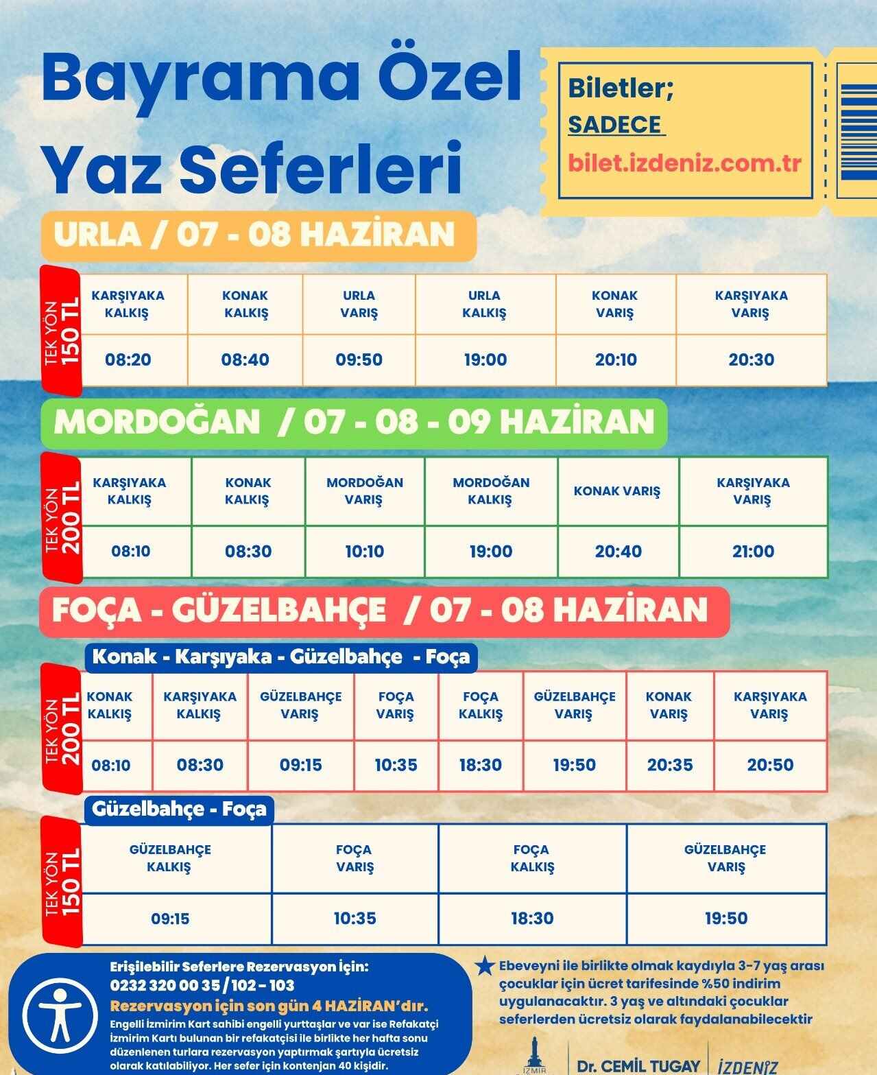 Biletler yalnızca internet üzerinden alınabilecek, iskelelerde gişe satışı yapılmayacak. Sefer saatleri ve detaylı bilgiye izdeniz.com.tr adresinden ulaşılabilecek. 3-7 yaş arasındaki çocuklar için yüzde 50 indirim uygulanırken, 3 yaş altındaki çocuklar ücretsiz seyahat edebilecek.