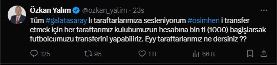 Sosyal medya platformu X üzerinden yaptığı paylaşımda dikkat çeken ifadeler kullanan Yalım, “Tüm Galatasaraylı taraftarlarımıza sesleniyorum. Osimhen’i transfer etmek için her bir taraftarımız kulübümüzün hesabına bin TL bağış yaparsa, bu önemli transferi gerçekleştirebiliriz. Eyy taraftarlarımız, ne dersiniz?” ifadelerini kullandı.