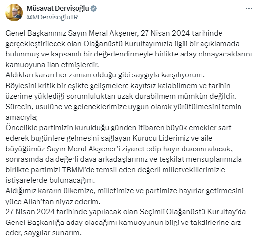 27 Nisan 2024 tarihinde yapılacak olan Seçimli Olağanüstü Kurultay’da Genel Başkanlığa aday olacağımı kamuoyunun bilgi ve takdirlerine arz eder, saygılar sunarım.