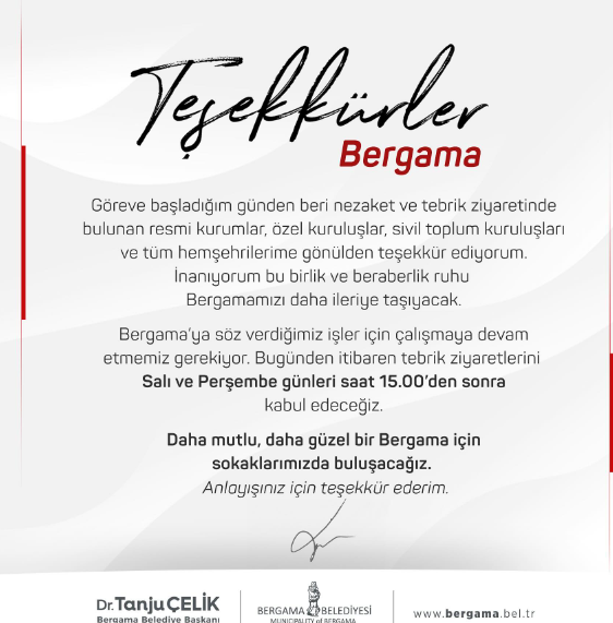 Göreve başladığı ilk günden itibaren nezaket ve tebrik ziyaretinde bulunanlara teşekkür eden Tanju Çelik, 'Bergama'ya söz verdiğimiz işler için çalışmaya devam etmemiz gerekiyor. Bugünden itibaren tebrik ziyaretlerini salı ve parşembe günleri saat 15.00'ten sonra kabul edeceğiz' mesajı verdi.