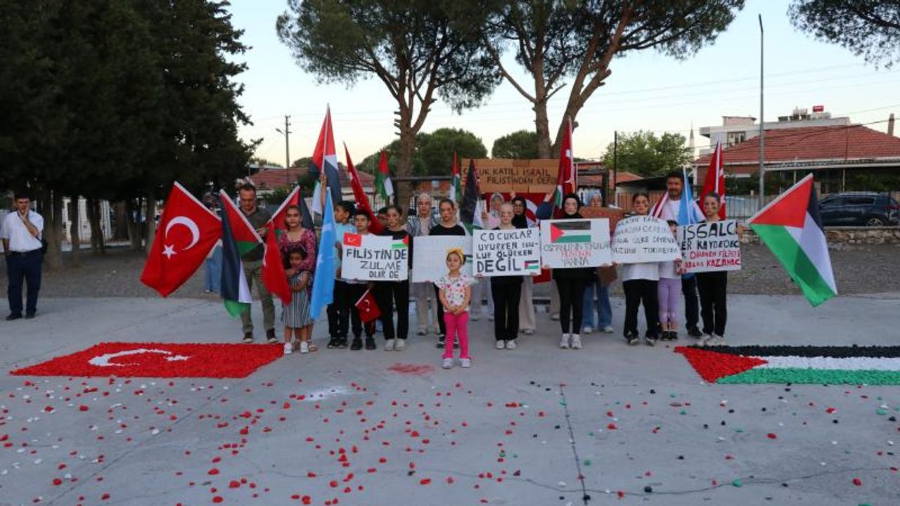 İsrail'in Filistin'e yönelik saldırılarını protesto etmek isteyen öğrenciler, Bergama Bilim ve Sanat Merkezi bahçesinde bir araya geldi. Öğrenciler, saldırılarda ölen çocukları temsil etmesi amacıyla boyadıkları 16 bin taştan Türkiye ve Filistin bayrağı yaparak bahçedeki alana dizdi. "Özgür Filistin", "Çocukları kurtarın", "Çocuklar uyurken susulur, ölürken değil" yazılı dövizleri taşıyan öğrenciler, İsrail'in saldırılarına tepki gösterdi.