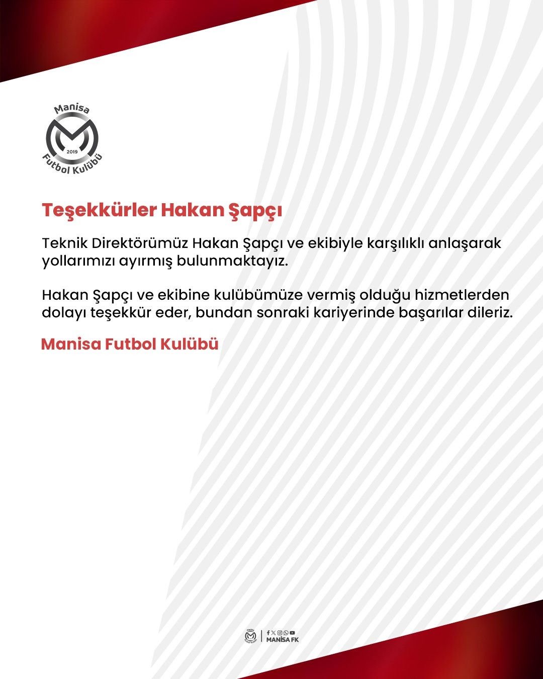 "Teknik Direktörümüz Hakan Şapçı ve ekibiyle karşılıklı anlaşarak yollarımızı ayırmış bulunmaktayız.
