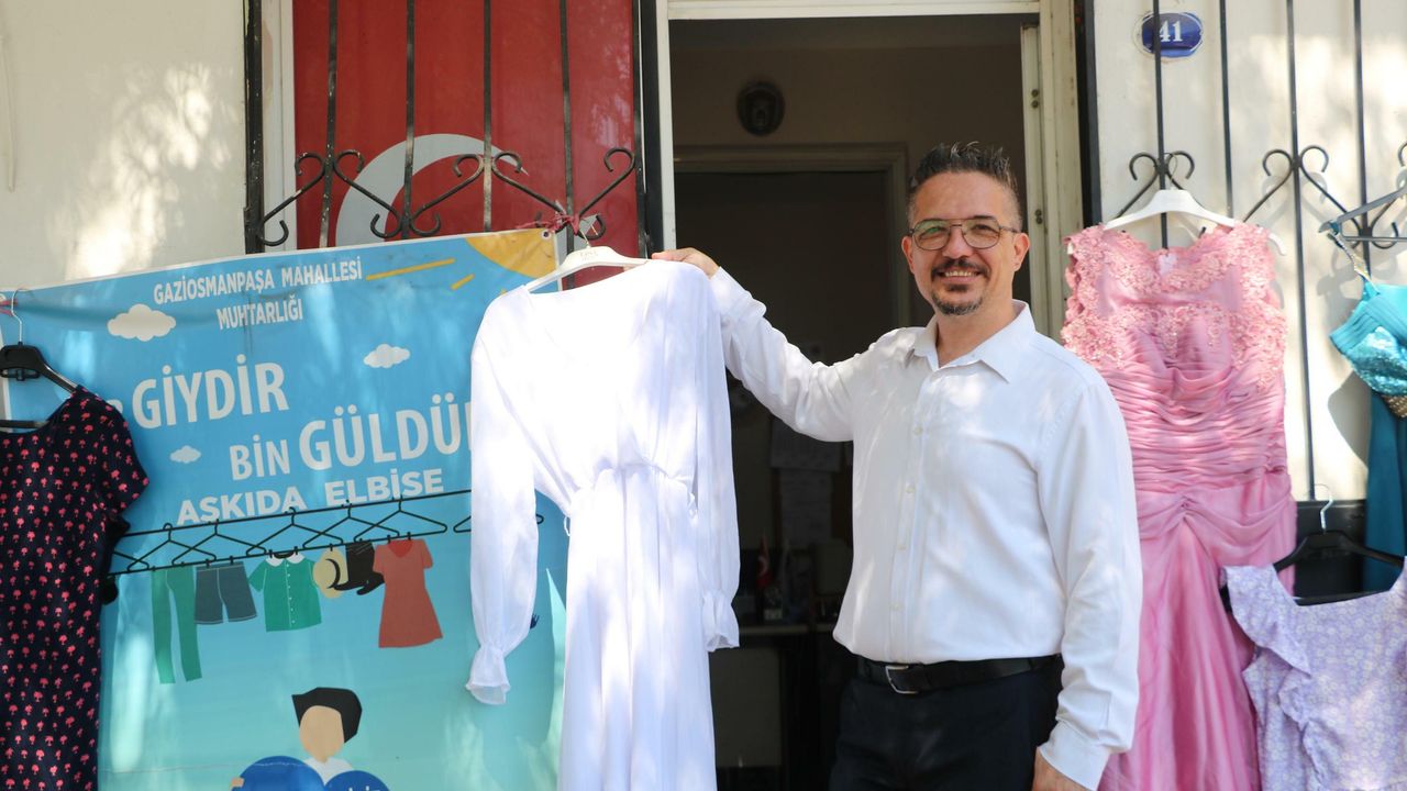 İzmir’in Bornova ilçesinde Gaziosmanpaşa Mahallesi Muhtarı Bekir Türkoğlu, ihtiyaç sahiplerine destek olmak için “Askıda Elbise” projesini hayata geçirdi. Muhtarlık binasının önünü butiğe dönüştüren Türkoğlu, hayırseverlerden topladığı yeni ve ikinci el kıyafetleri askılara asarak mahallede ihtiyaç sahibi ailelere ve çocuklara ulaştırıyor.