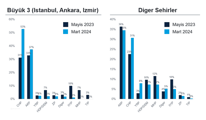 - AK Parti'nin oy oranının aslında Mayıs 2023 seçimlerine göre düşmediğini, aksine az da olsa arttığını görüyoruz. Fakat 3 büyük şehirde gecen sene yüzde 7 olarak gerçekleşen MHP oylarının büyük şehirlerde AK Parti'ye gittiğini de unutmamak lazım.