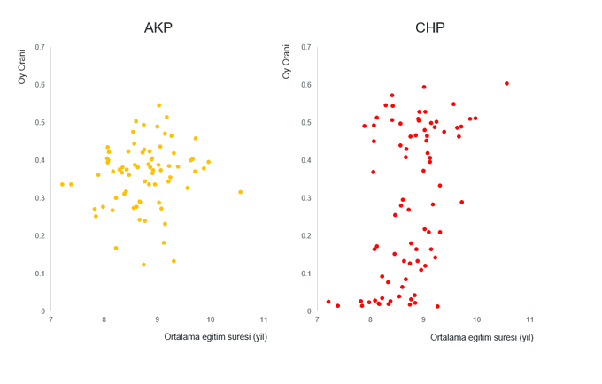 1) Ortalama egitim suresi (yil) ve iki buyuk partinin oy oranları