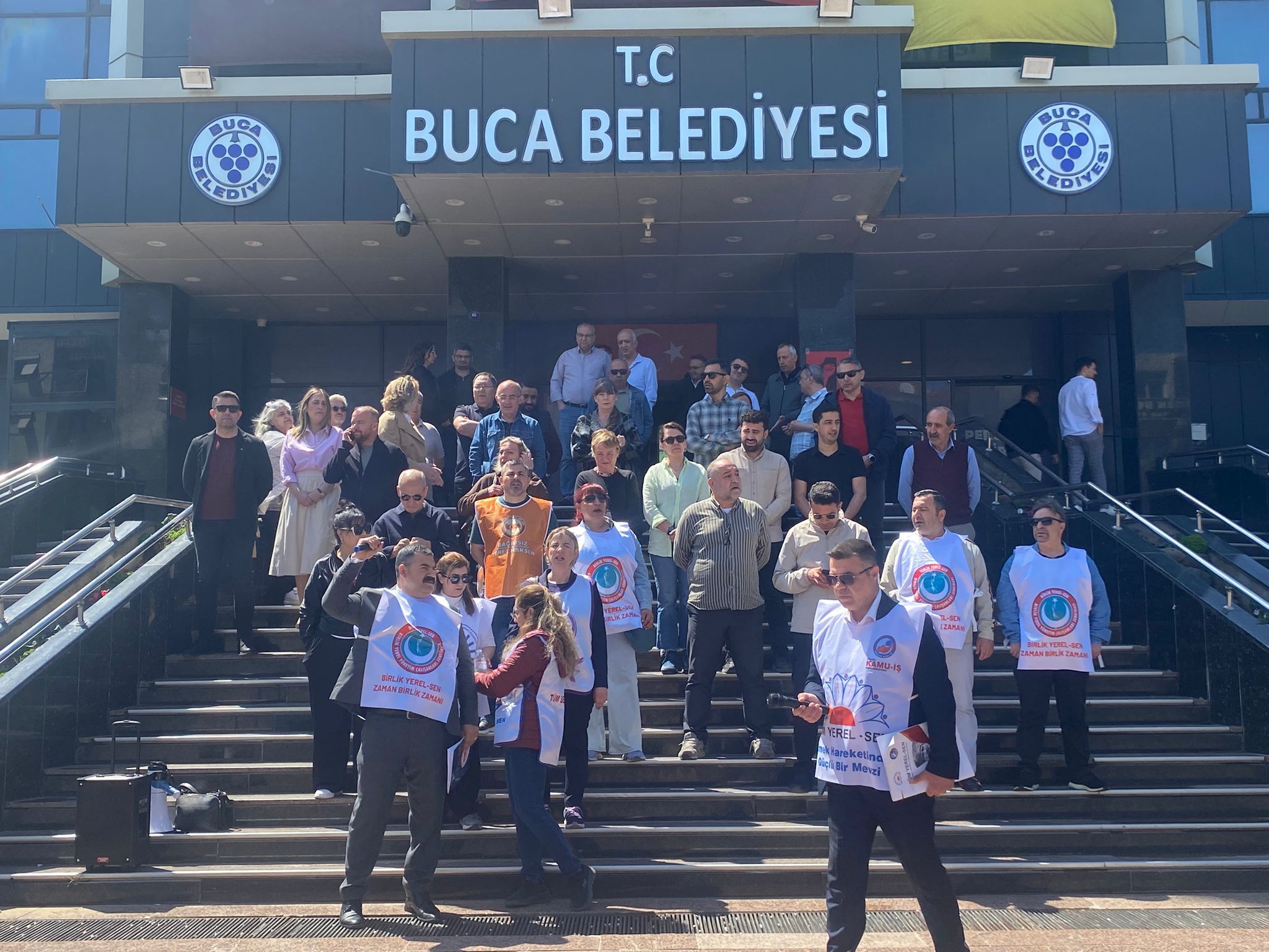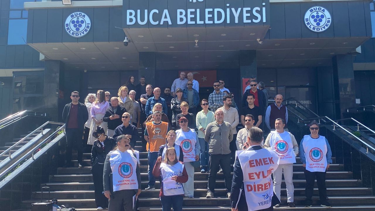 Son Mühür/ Emine Kulak- İzmir’in Buca ilçesinde belediye ile Tüm Bel Sen İzmir Şubeleri arasında yürütülen Toplu İş Sözleşmelerinde uzlaşma sağlanamadığı için başlatılan eylem bugün de devam ediyor. Dün CHP İzmir İl Başkanı Çağatay Güç ile görüşme yapan memurların sendika yöneticileri belediye önünde seslerini duyurmaya devam ediyor.
