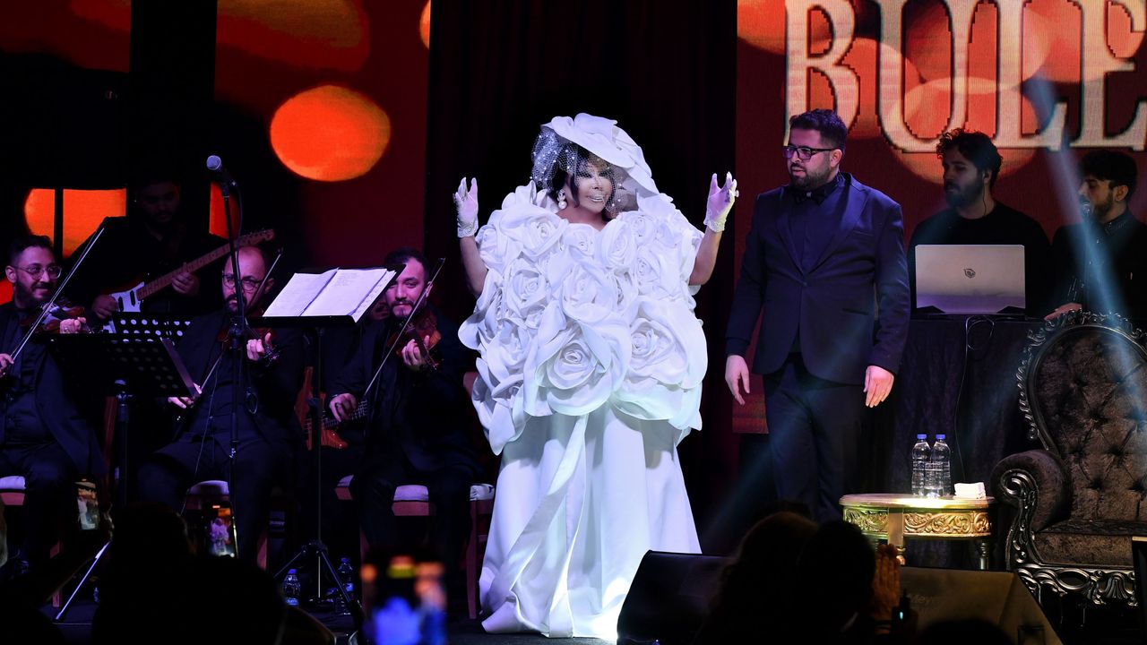 İzmir'de sevenlerine muhteşem bir gece yaşatan Bülent Ersoy'un kostümü çok dikkat çekti. Ünlü modacı Tolga Çam imzasını taşıyan 3,5 m. kuyruklu beyaz straplez elbisesi, beyaz güllerden oluşan muhteşem kabı ve de başındaki beyaz gül şapkası ile Fransız tül vualetiydi.