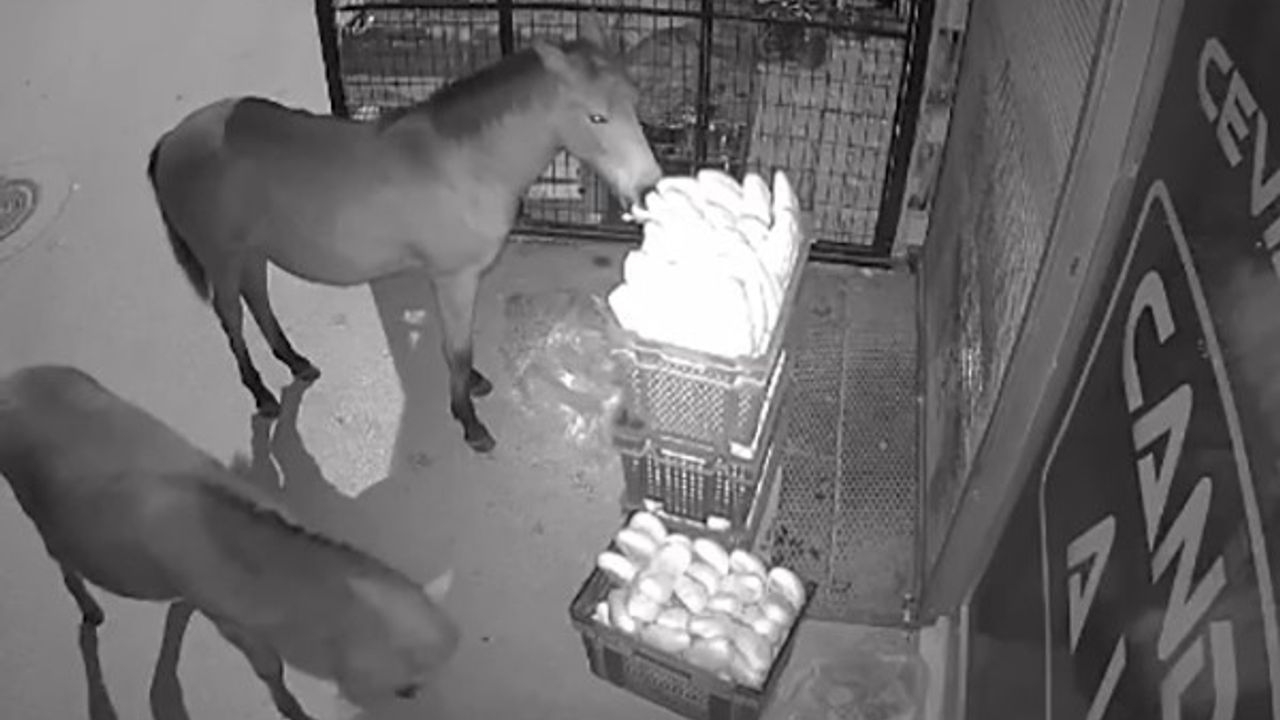 Olay, Bursa’nın merkez Yıldırım ilçesi Şirinevler Mahallesi’nde gerçekleşti. Sabah saatlerinde markette satılmak üzere bırakılan taze ekmekleri yoldan geçen başıboş atlar fark etti. Sıcak ekmeğin kokusunu alan atlar sepetlerdeki ekmekleri yedi. Sabah marketi açmak için gelen işyeri sahibi ekmeklerin yenmiş olduğunu görünce güvenlik kameralarına koştu. Gerçeği güvenlik kameralarında gören talihsiz adam gördükleri karşısında şaşkınlığını gizleyemedi.