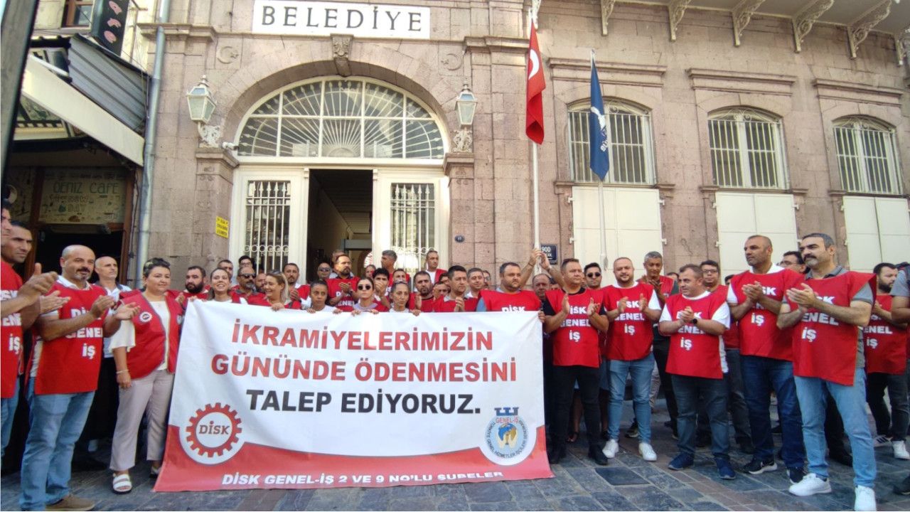 İzmir Büyükşehir Belediyesi'nin iştiraklerinden İZENERJİ'de örgütlü olan DİSK Genel-İş İzmir 2 ve 9 Nolu Şubeleri, ikramiyelerin zamanında ödenmemesi üzerine bir basın açıklaması gerçekleştirdi. İzmir Büyükşehir Belediye Başkanı Cemil Tugay’ın makamının bulunduğu egemenlik evi önünde toplanan sendika yöneticileri ve işyeri temsilcileri, uyarı eylemi yaptı. Genel-İş üyeleri, "İkramiyelerin gününde ödenmesini talep ediyoruz" yazılı pankart açarak tepkilerini dile getirdi.