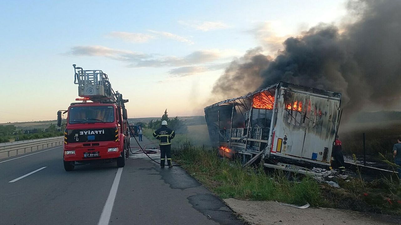 Olay, dün akşam saat 19.00 sularında Çanakkale-Edirne karayolu üzerinde, Gelibolu'ya bağlı Bolayır köyü civarında yaşandı. Kimliği henüz belirlenemeyen H.A.Y. idaresindeki plakası öğrenilemeyen TIR, sürücüsünün direksiyon kontrolünü yitirmesi sonucu aniden kontrolden çıktı. Asfaltı terk ederek tarlaya savrulan devasa araç, çarpmanın etkisiyle kısa sürede alev topuna döndü.